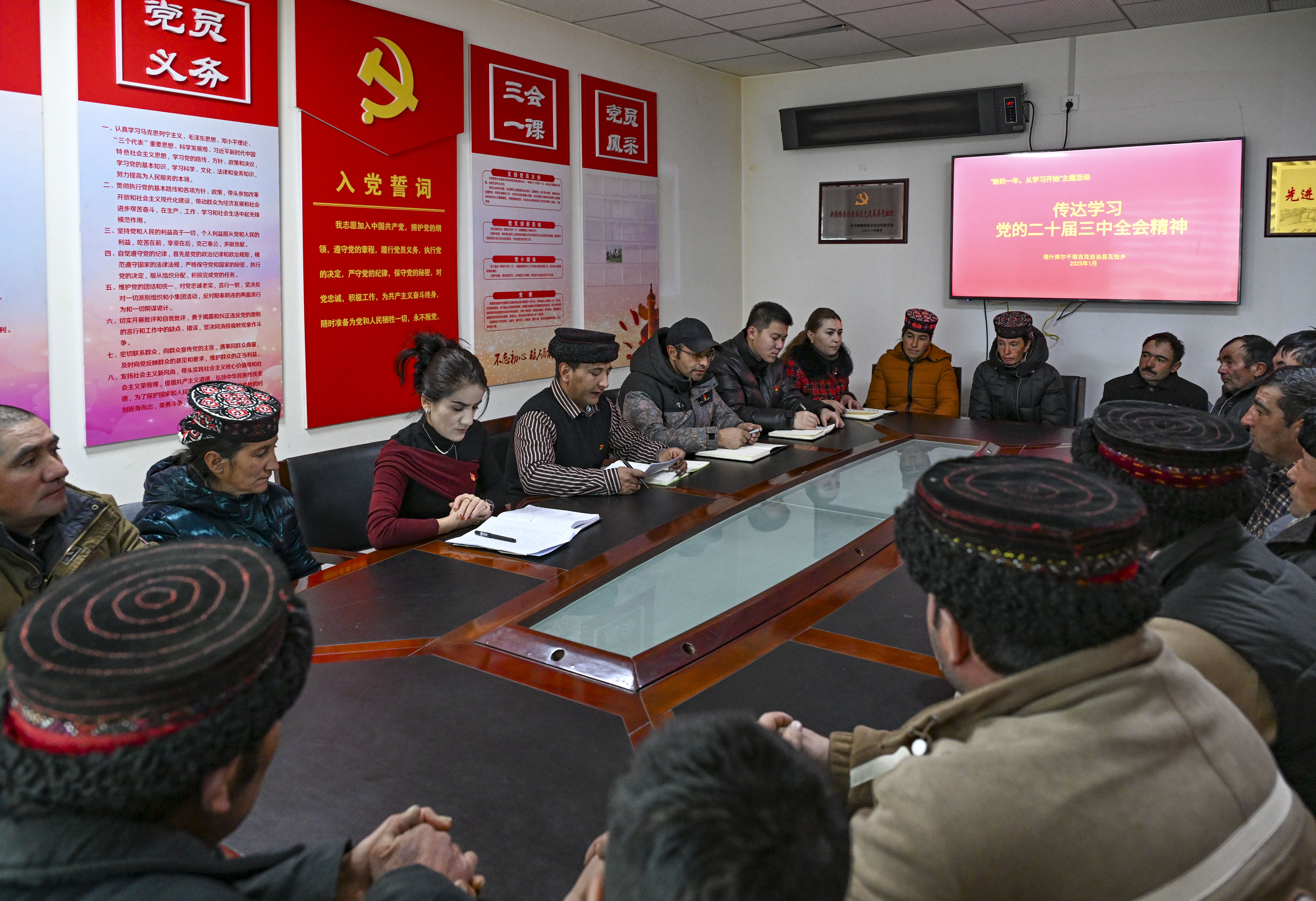 多来提曼·开米克在新疆喀什地区塔什库尔干塔吉克自治县瓦恰乡夏拉夫迭村宣讲党的二十届三中全会精神(2025年1月4日摄)。