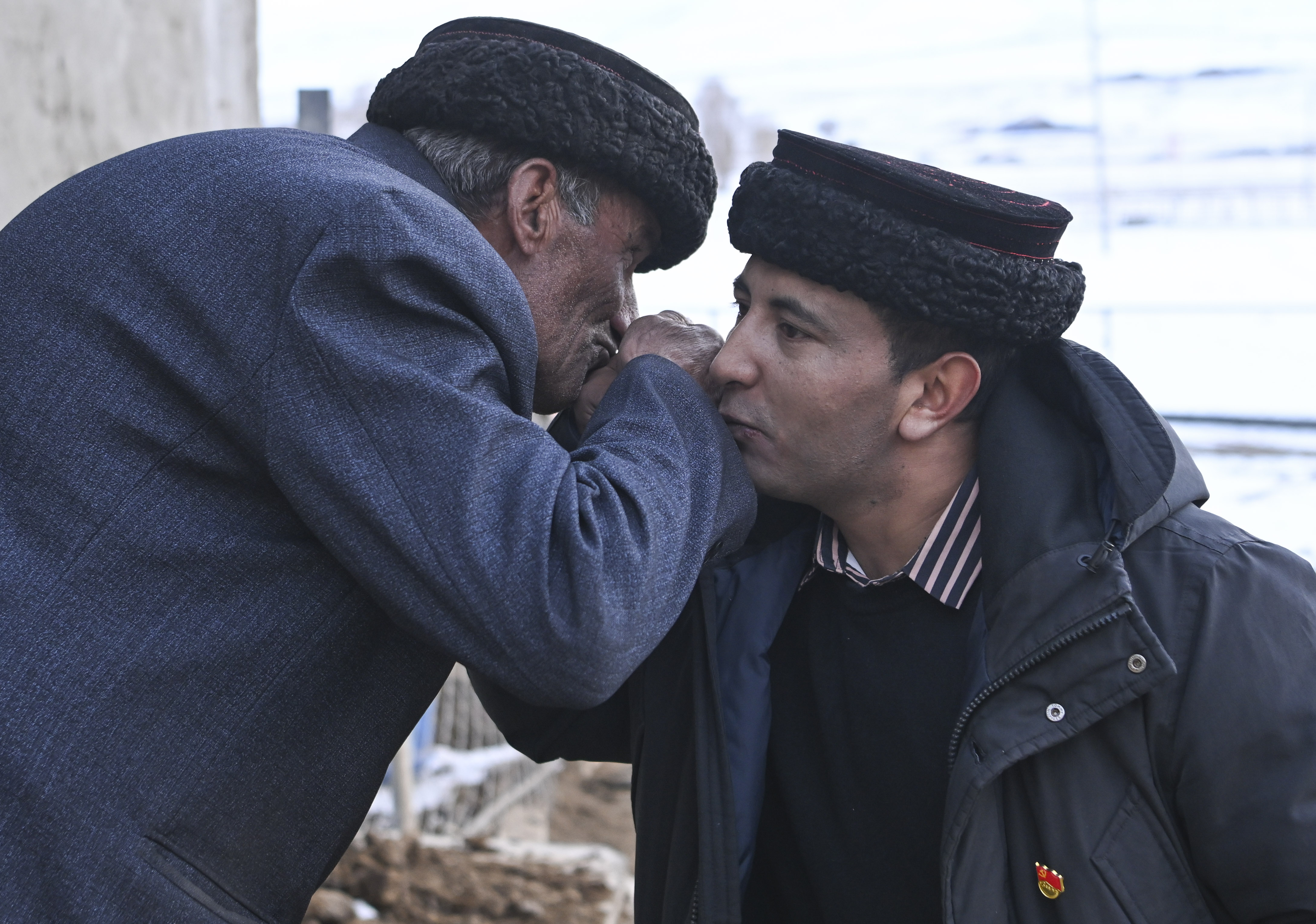 多来提曼·开米克(右)在村里走访时,与一位长者行“吻手贴面”礼(2025年1月3日摄)。