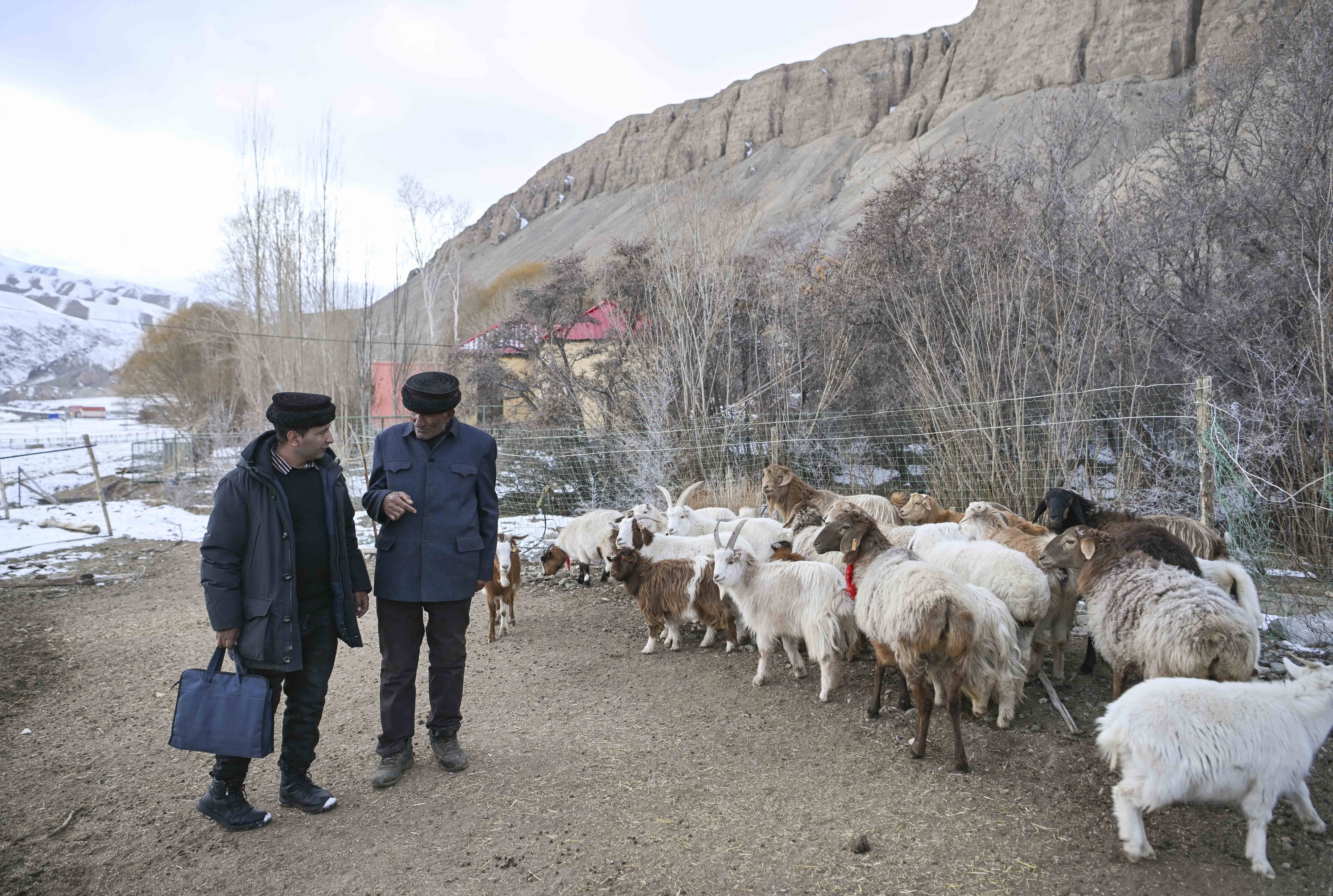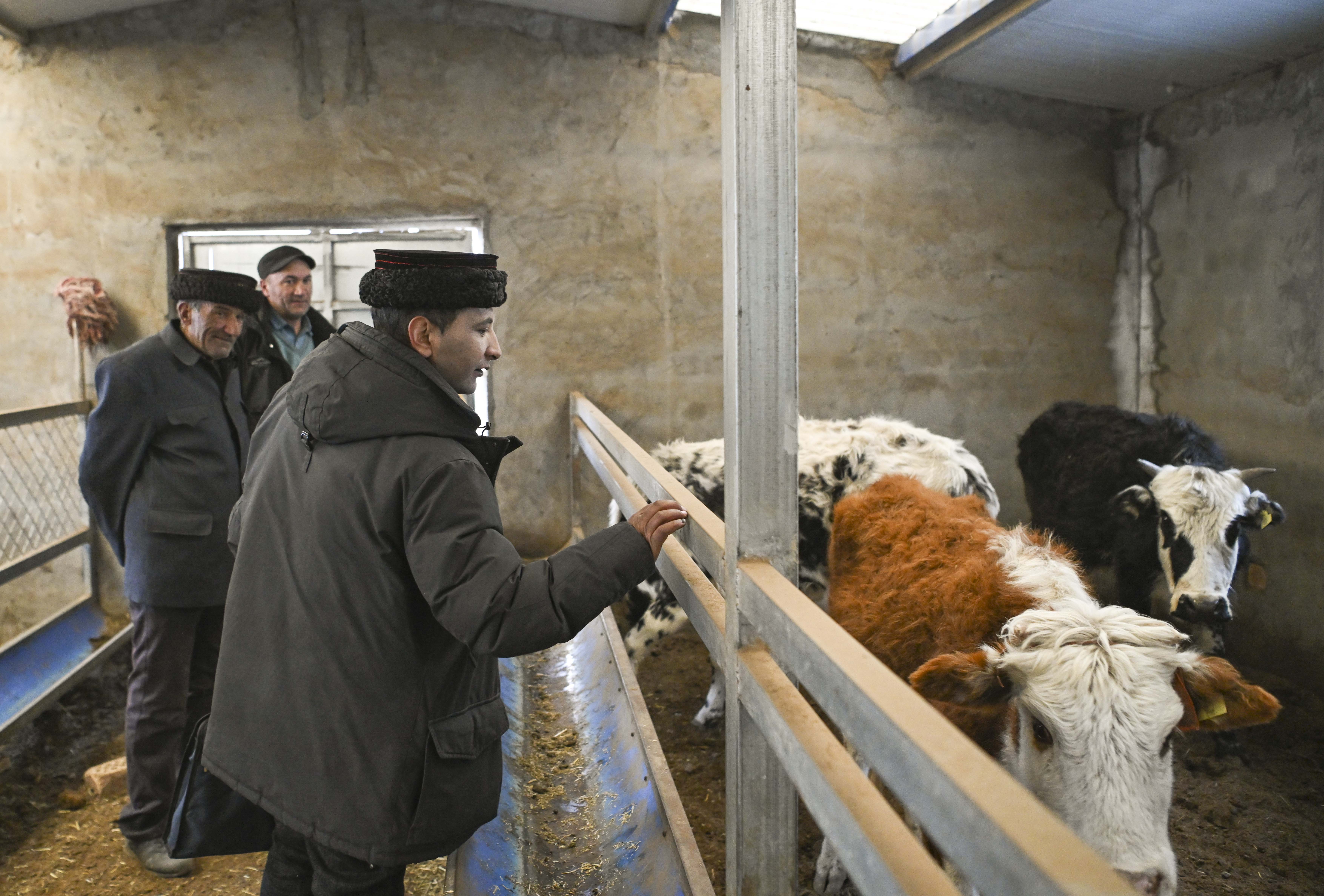 在新疆喀什地区塔什库尔干塔吉克自治县瓦恰乡夏布孜喀拉村,多来提曼·开米克在一户村民的棚圈中实地了解牲畜越冬情况(2025年1月3日摄)。