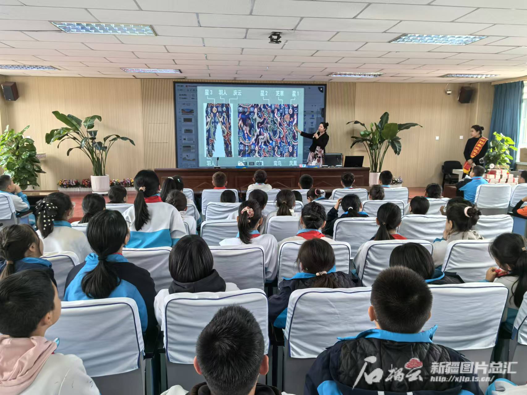2024年10月25日,卓娅·巴合提为阿勒泰市中心小学学生讲述“五星出东方利中国”织锦护臂。杨丽摄