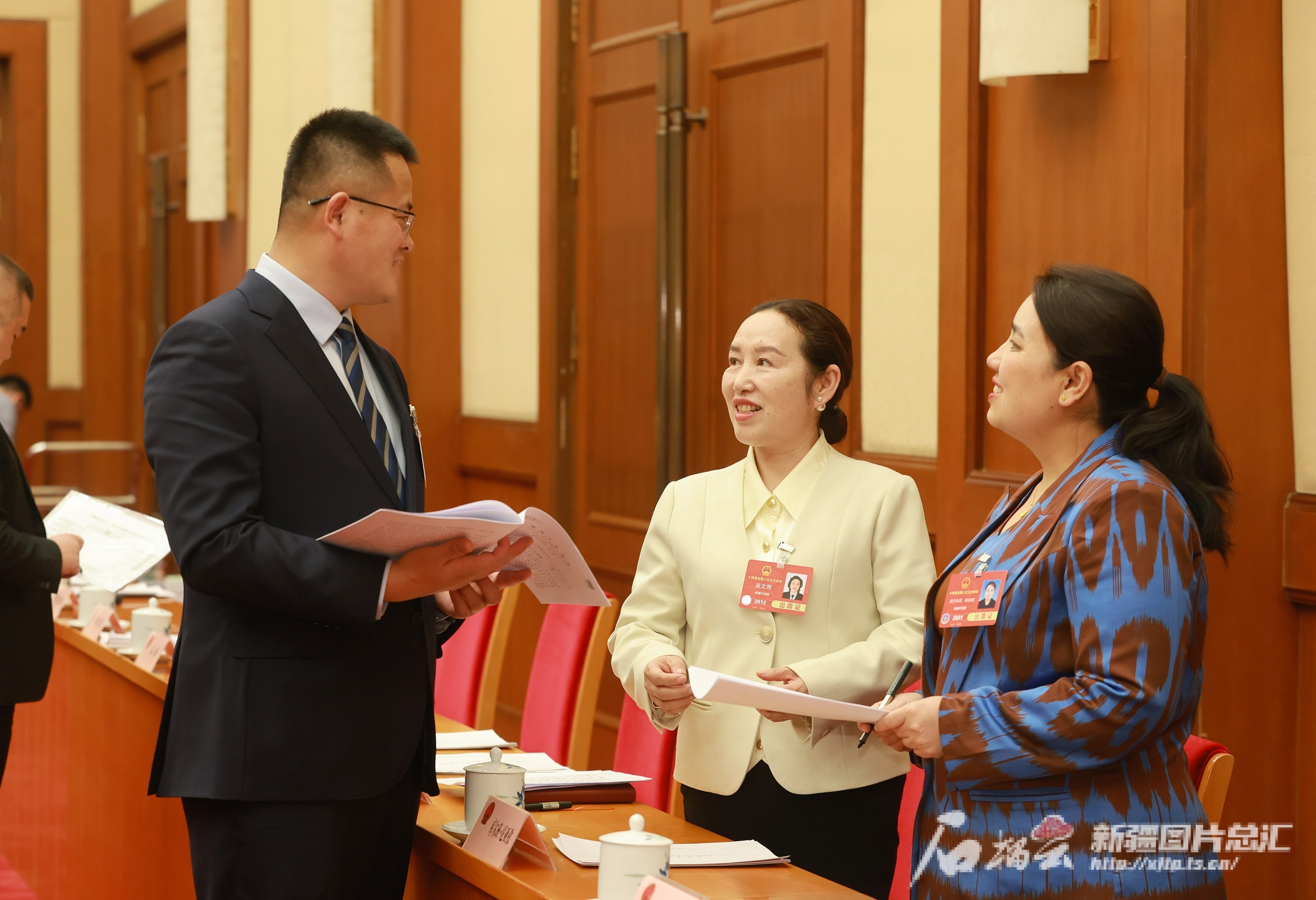 3月5日,参加十四届全国人大三次会议的新疆代表团举行全体会议,审议政府工作报告。这是吴文秀代表(中)会前围绕“推动农业增效益、农村增活力、农民增收入”等内容与其他代表交流。天山网-新疆日报记者 崔志坚摄