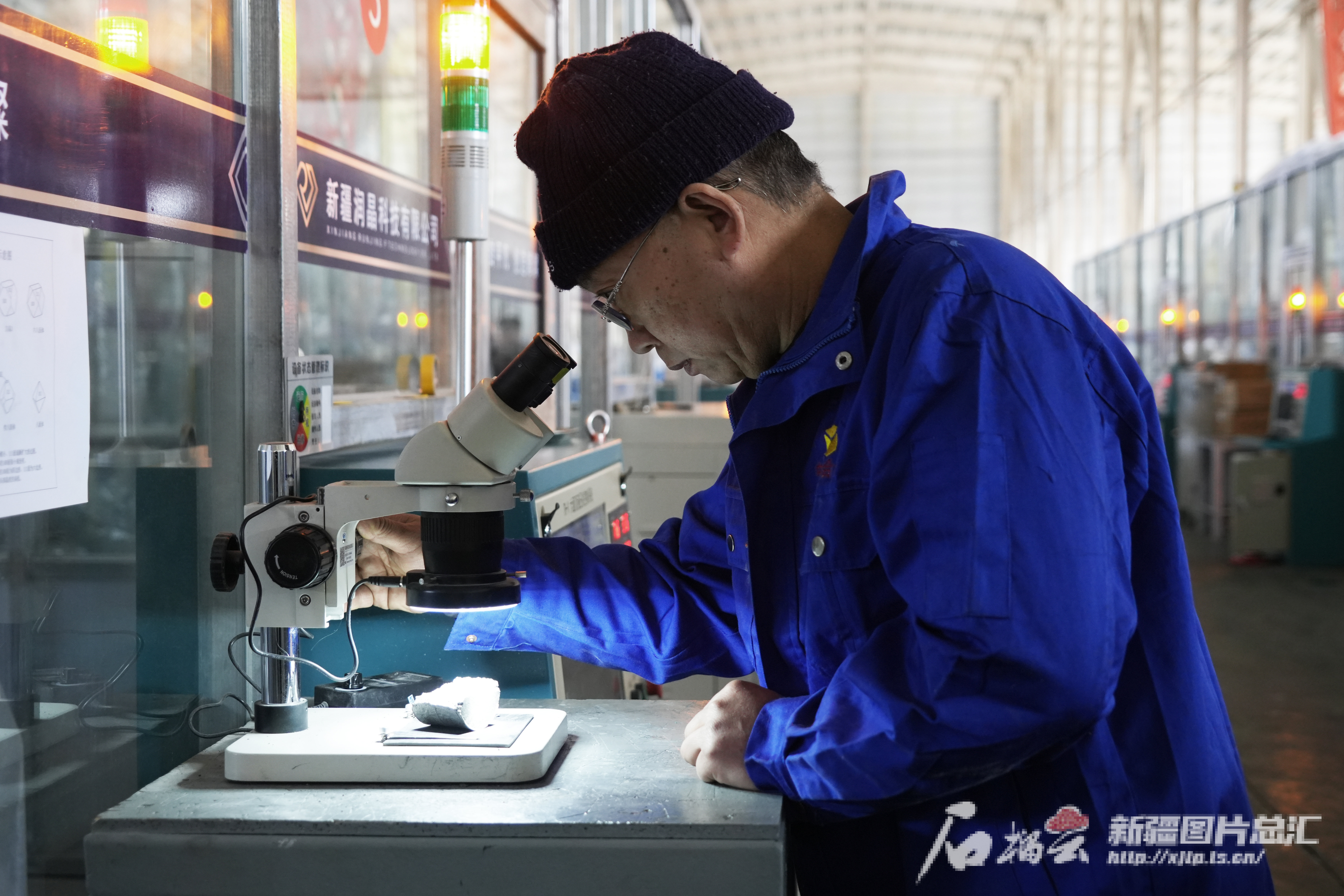 3月4日,在哈密高新技术产业开发区南部循环经济产业园,新疆润晶科技有限公司技术人员在查看金刚石单晶产品。郭子毅摄
