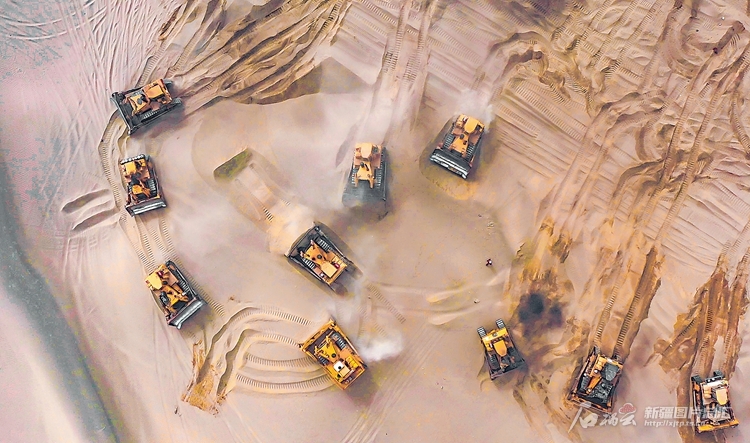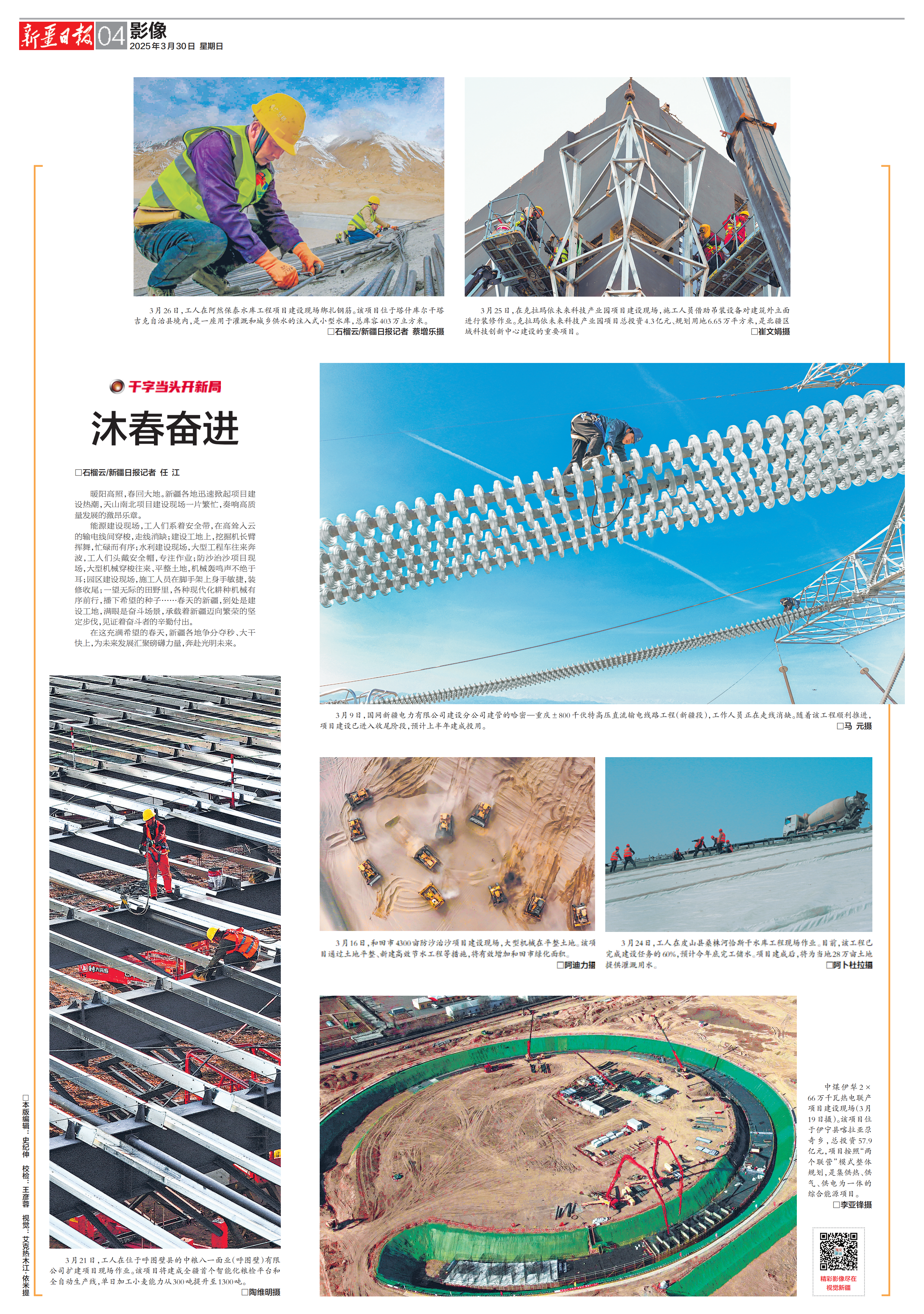能源建设现场,工人们系着安全带,在高耸入云的输电线间穿梭,走线消缺;建设工地上,挖掘机长臂挥舞,忙碌而有序;水利建设现场,大型工程车往来奔波,工人们头戴安全帽,专注作业;防沙治沙项目现场,大型机械穿梭往来、平整土地,机械轰鸣声不绝于耳;园区建设现场,施工人员在脚手架上身手敏捷,装修收尾;一望无际的田野里,各种现代化耕种机械有序前行,播下希望的种子……春天的新疆,到处是建设工地,满眼是奋斗场景,承载着新疆迈向繁荣的坚定步伐,见证着奋斗者的辛勤付出。