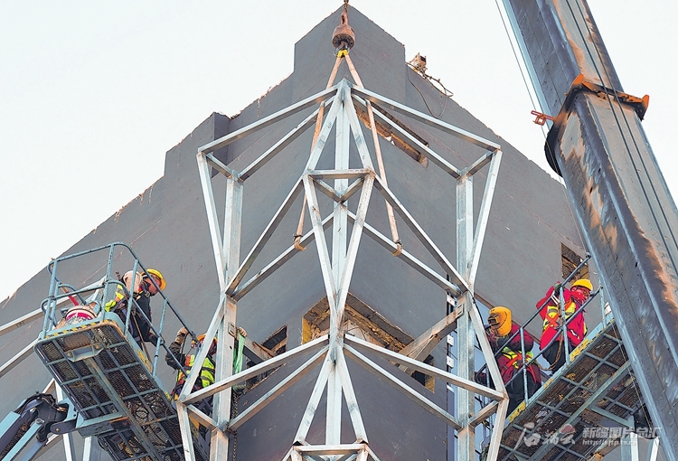 3月25日,在克拉玛依未来科技产业园项目建设现场,施工人员借助吊装设备对建筑外立面进行装修作业。克拉玛依未来科技产业园项目总投资4.3亿元、规划用地6.65万平方米,是北疆区域科技创新中心建设的重要项目。 □崔文娟摄