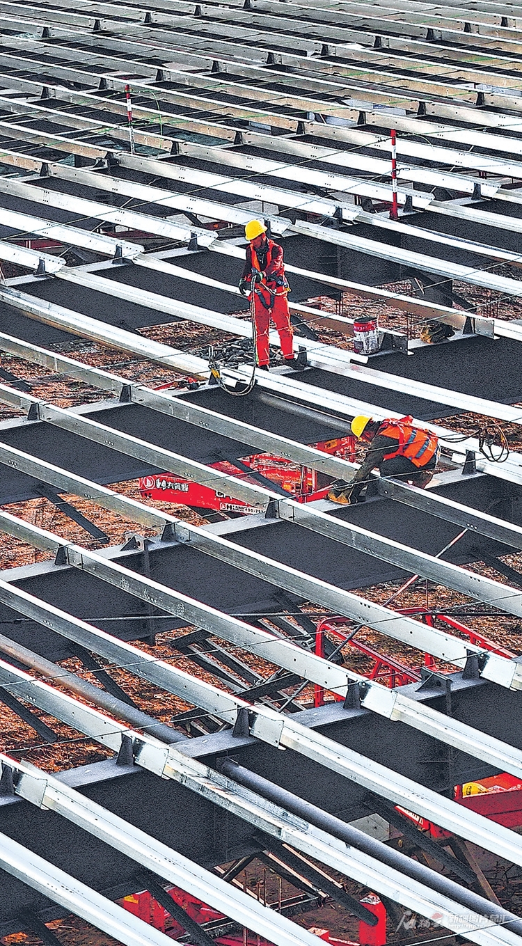 3月21日,工人在位于呼图壁县的中粮八一面业(呼图壁)有限公司扩建项目现场作业。该项目将建成全疆首个智能化粮检平台和全自动生产线,单日加工小麦能力从300吨提升至1300吨。□陶维明摄