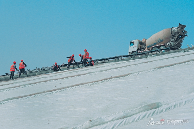 3月24日,工人在皮山县桑株河恰斯干水库工程现场作业。目前,该工程已完成建设任务的60%,预计今年底完工储水。项目建成后,将为当地28万亩土地提供灌溉用水。 □阿卜杜拉摄