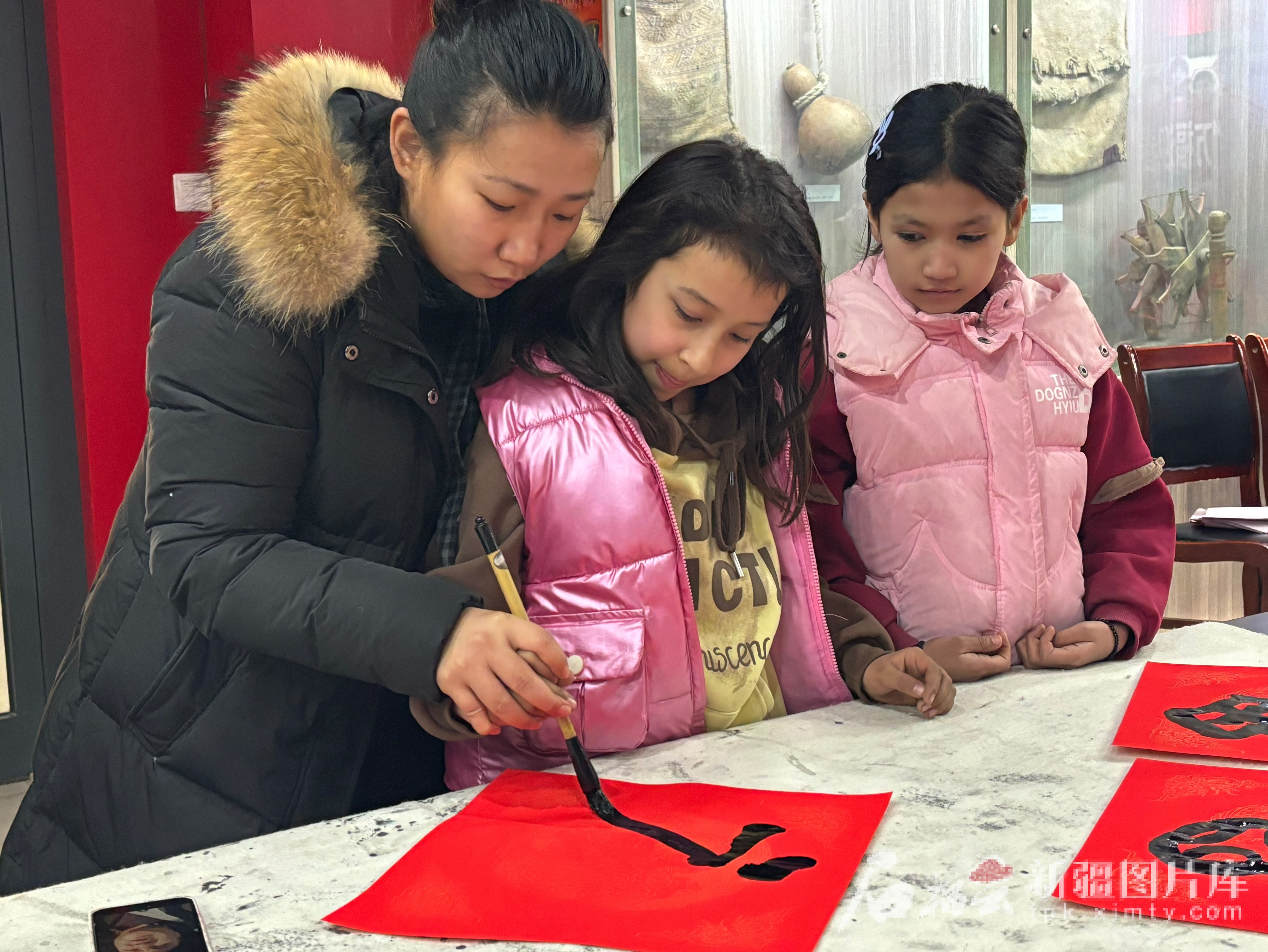 刘铮与社区居民家的孩子共同写“福”字。(资料图)图片由受访者本人提供