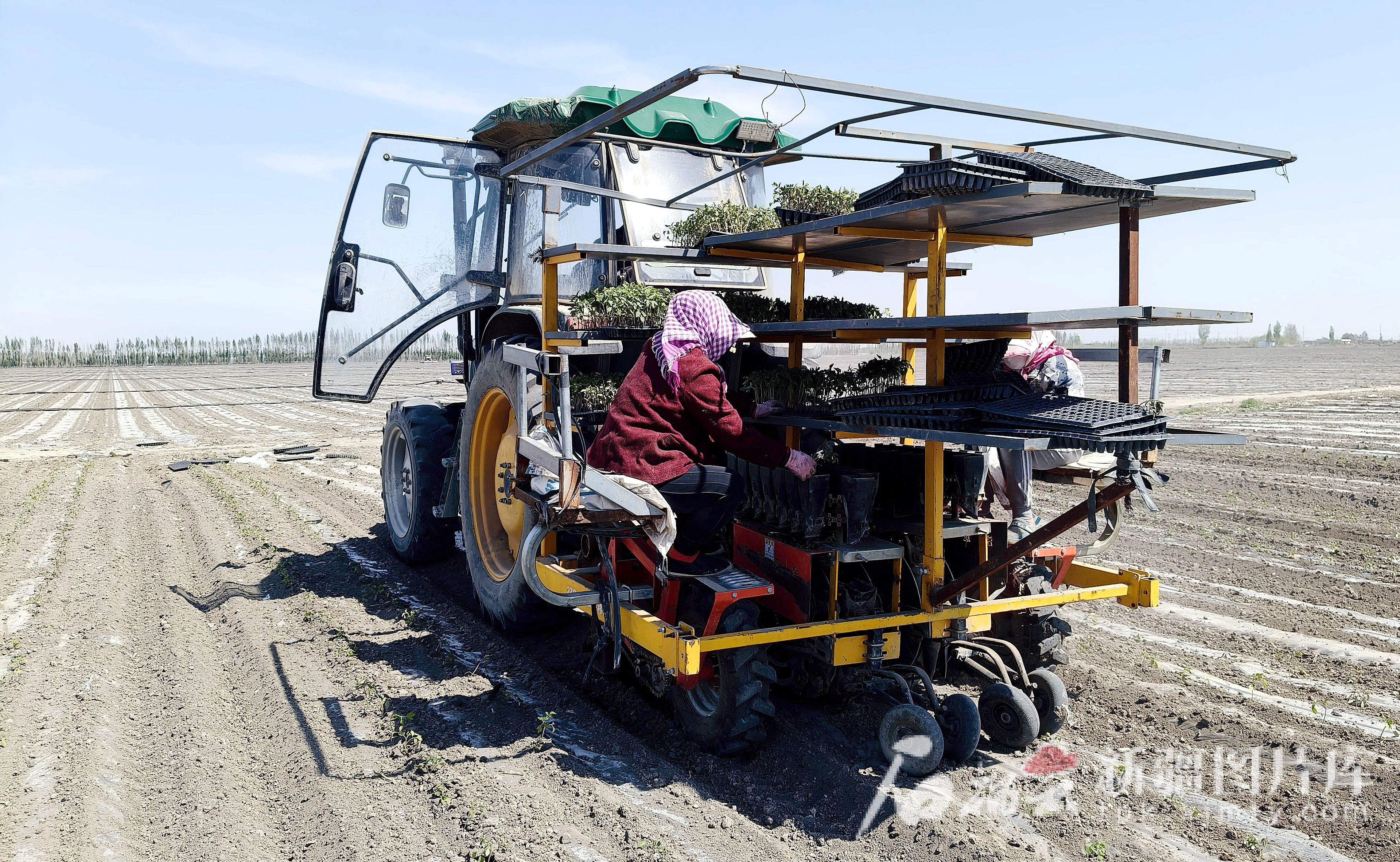 4月29日,沙湾市乌兰乌苏镇头浮新村500余亩订单番茄地里,番茄秧苗移栽机正在作业。乌苏市融媒体中心供图