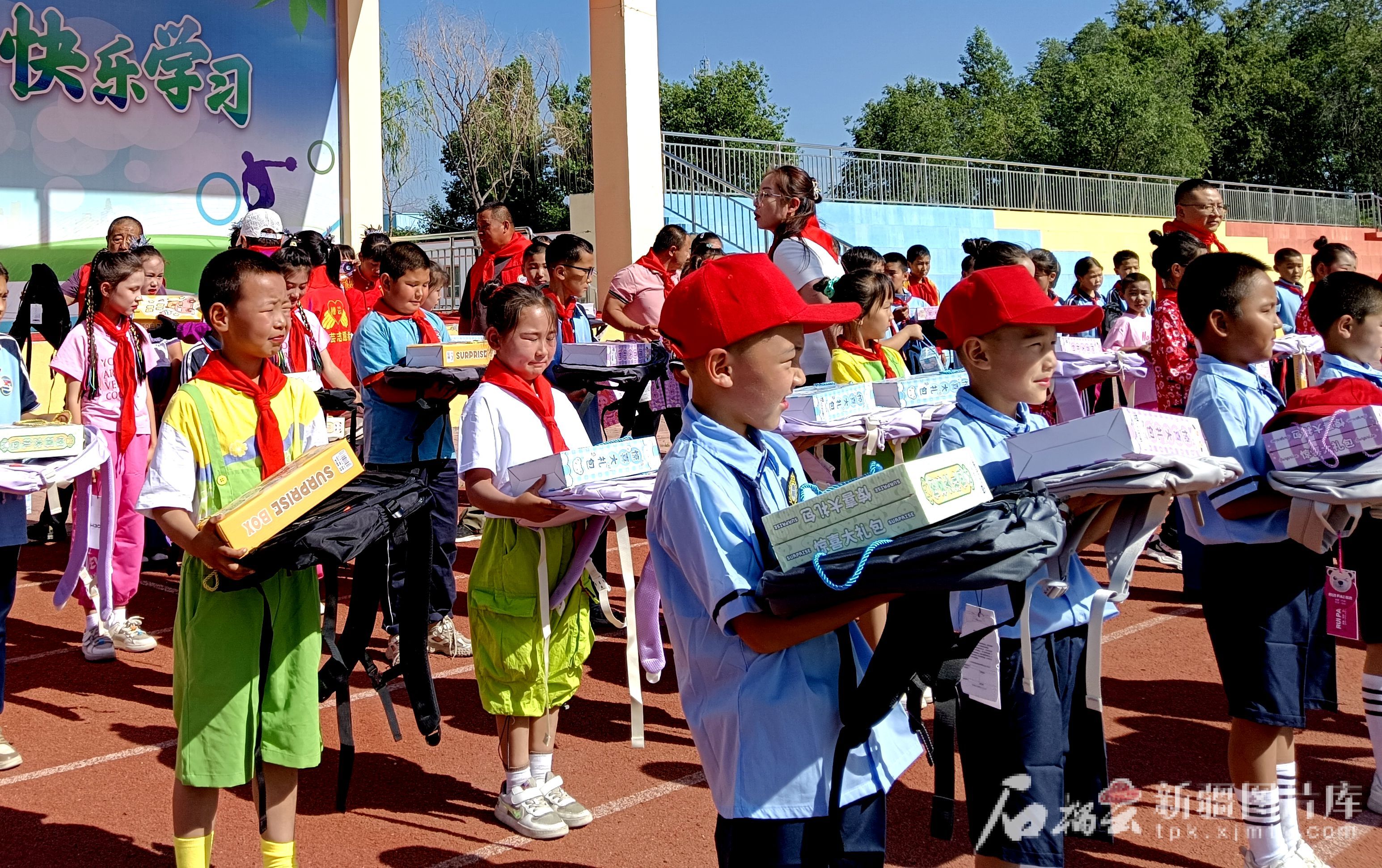 5月29日,博州红十字博芸志愿者服务队走进博乐市阿热勒托海中心学校,为学生捐赠书包文具。周秋丽摄