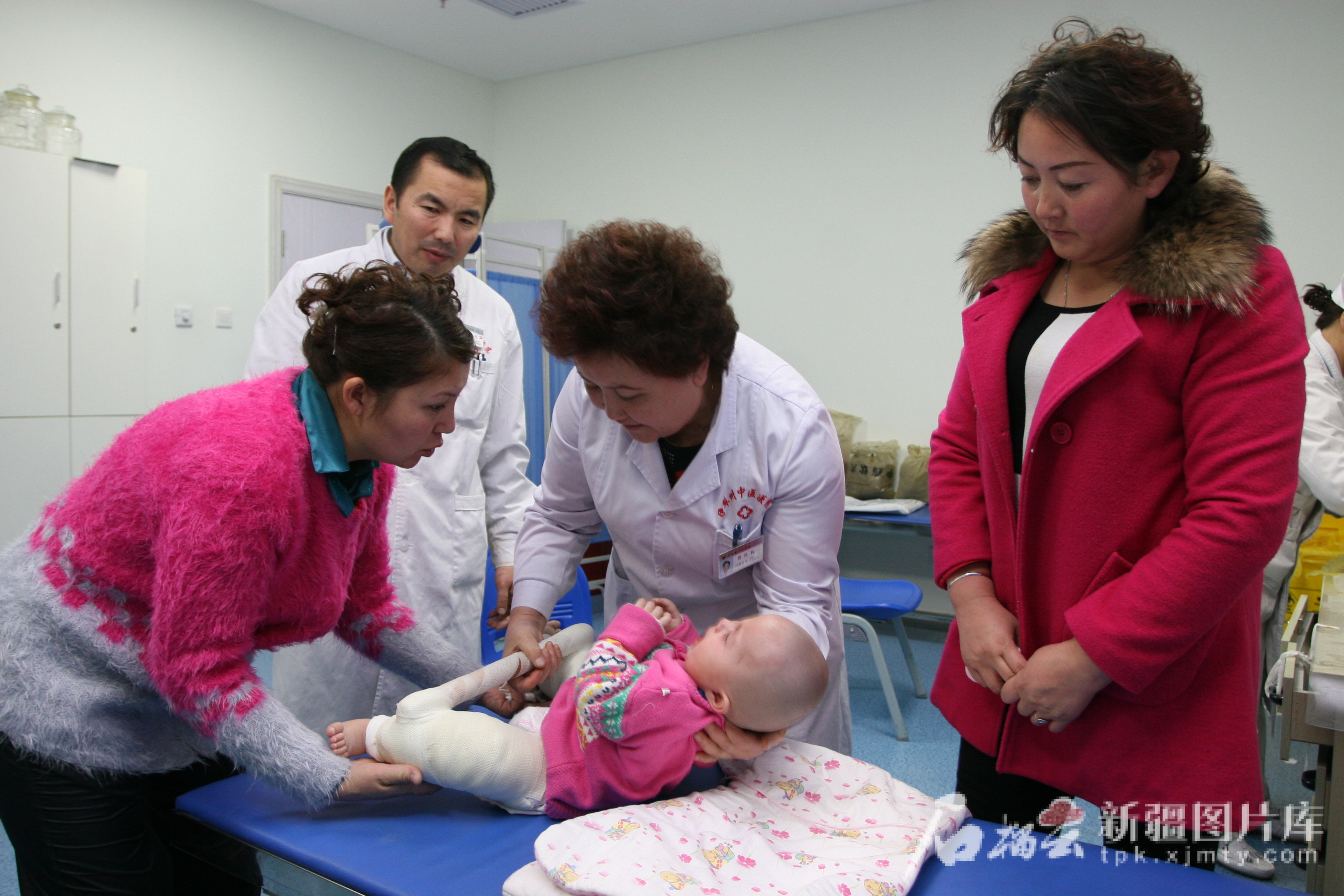 江阿古丽·艾山(右二)为一名未满周岁的患者治疗(拍摄于2015年)。伊犁州中医医院供图