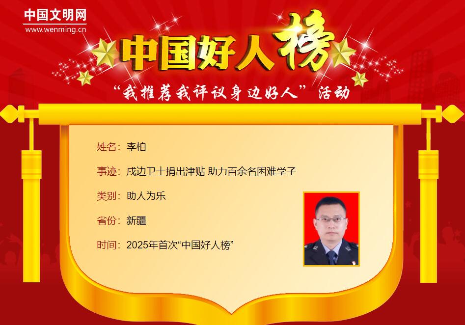 6月24日,2025年首次“中国好人榜”发布仪式暨全国道德模范与身边好人现场交流活动在河南省安阳市红旗渠纪念馆举办。经各地推荐、网友评议和专家评审等环节,共有152人(组)助人为乐、见义勇为、诚实守信、敬业奉献、孝老爱亲身边好人光荣上榜。其中,新疆(含兵团)2人上榜,他们是捐出津贴,助力百余名困难学子的戍边卫士李柏和跳入冰冷渠水救出老人的退役军人张智勇。