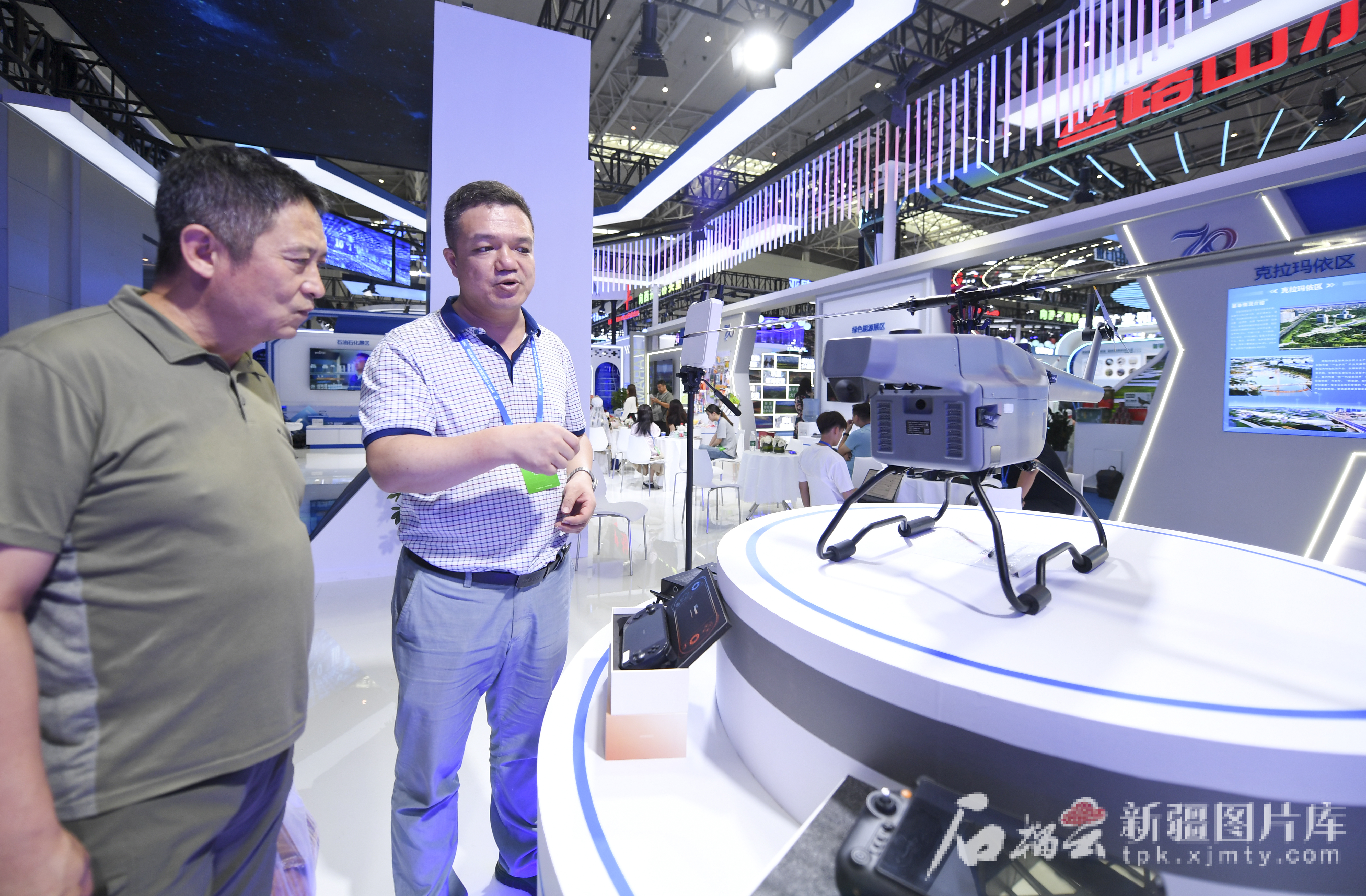 6月27日,参观者在克拉玛依展位了解智能巡检飞行器材。