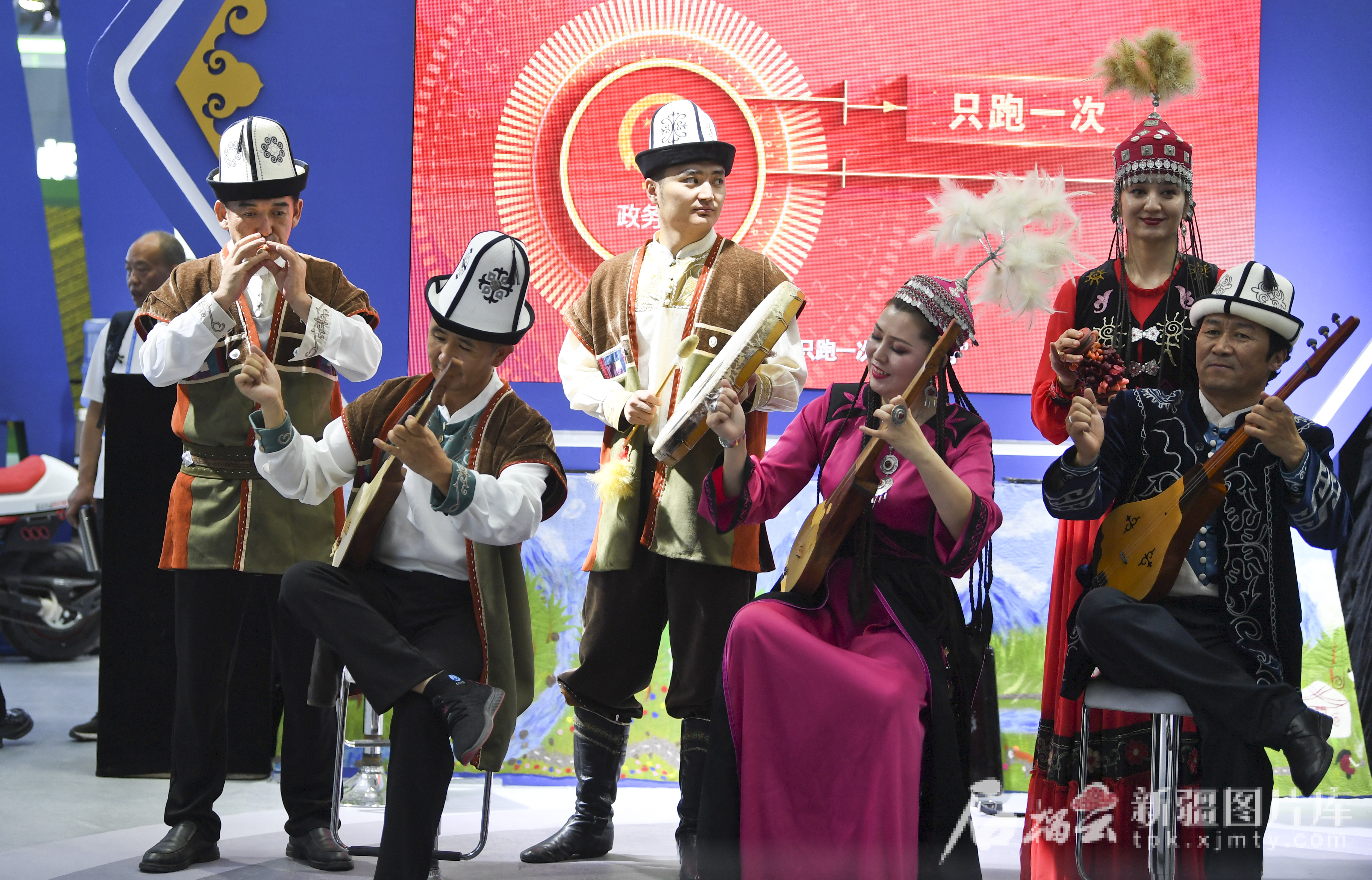 演员在克孜勒苏柯尔克孜自治州展位前表演玛纳斯弹唱。