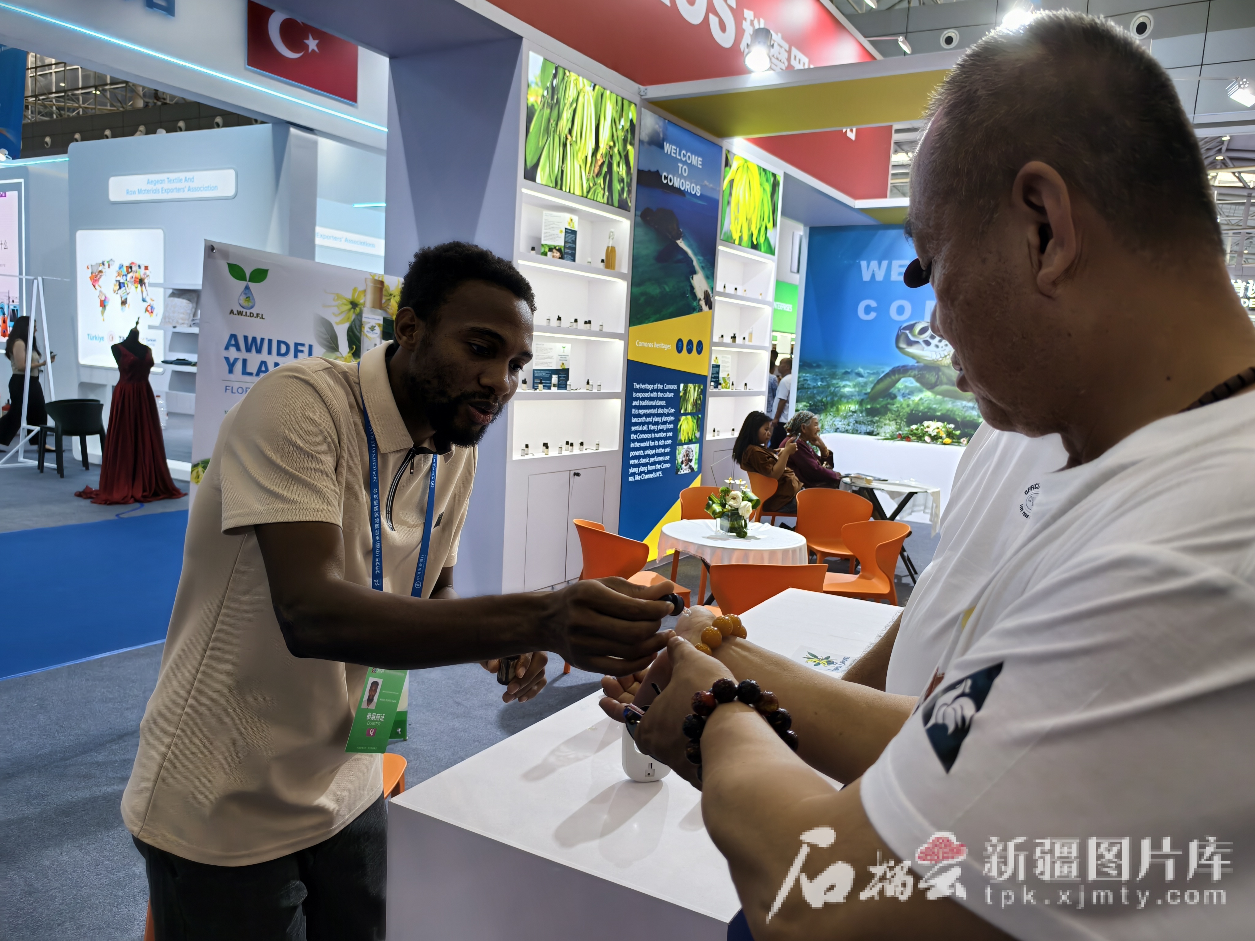 6月29日,科摩罗小伙阿卜杜拉·丹尼尔用流利中文推介依兰精油。石榴云/新疆日报记者 黑宏伟摄