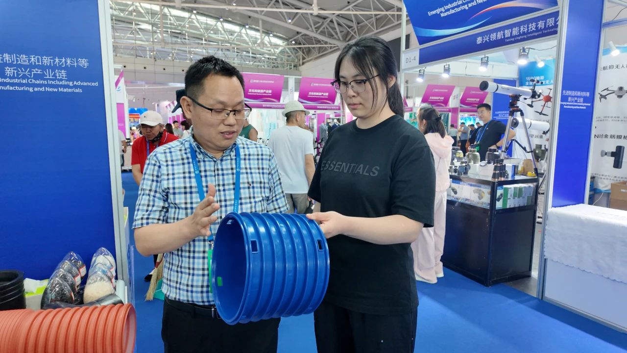 隔壁D31展位,国天成新材料科技有限公司的新型管材同样引人注目。“今年展会,我们带来了全新推出的双承插结构壁管材。”该公司总经理戴天文指着面前的样品介绍,“它解决了管材遇到温差时,因热胀冷缩造成扩口头连接处松脱漏水等问题,还提高了环保性能。”商博会开幕仅半天,该公司就已接待了来自哈萨克斯坦、乌兹别克斯坦等国的十余批客商。