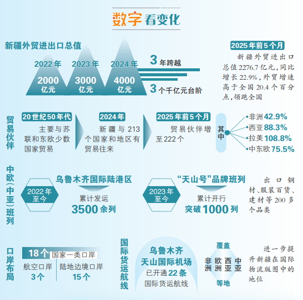 从最初仅与少数几个周边国家开展边境贸易,到如今与全球222个国家和地区建立稳定贸易往来;从连接中亚到辐射欧洲;从单一的大宗商品交易发展为跨境电商、市场采购、“保税+”等新业态百花齐放……新疆正加速迈向开放型经济新高地。