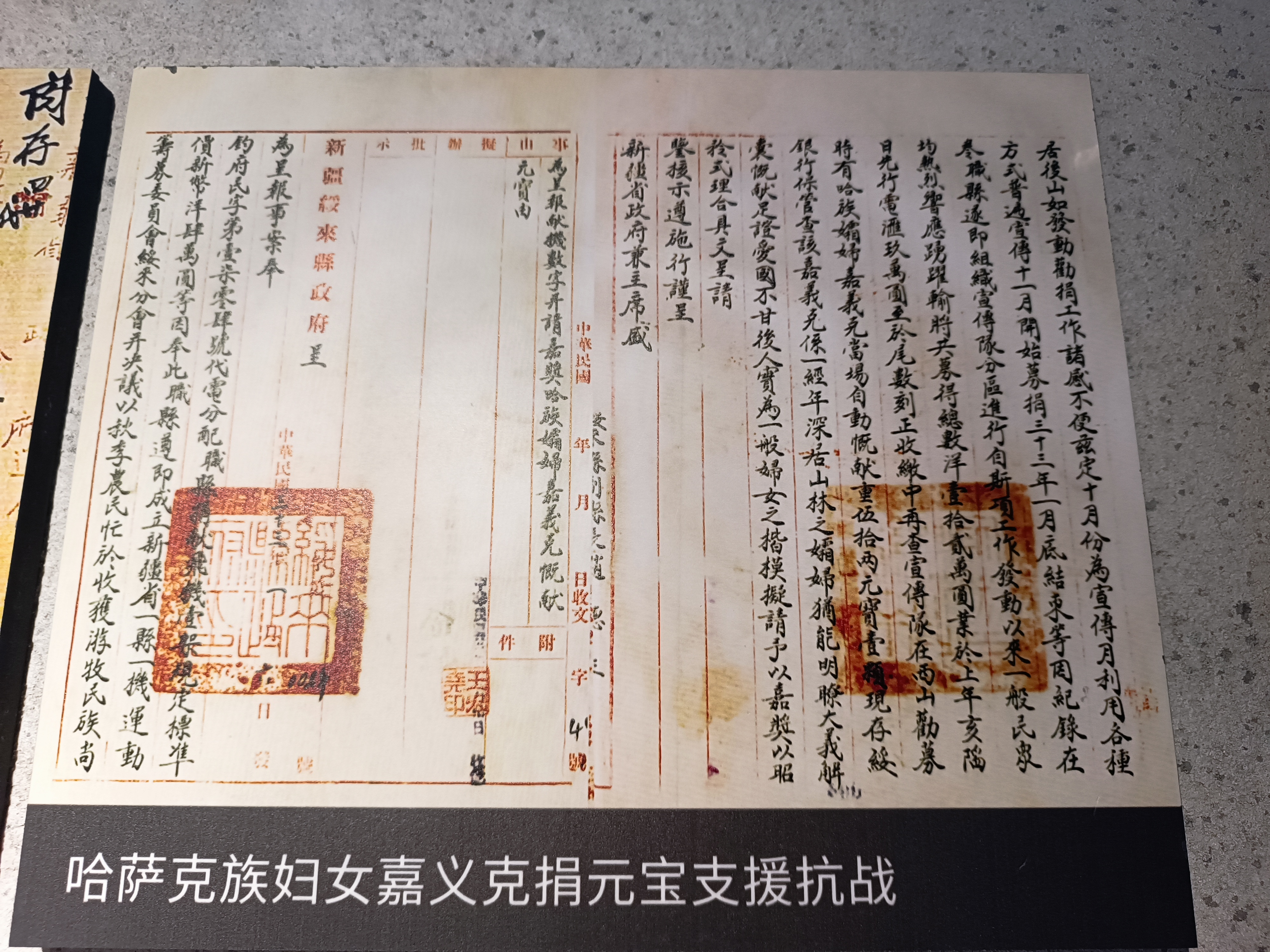 “一经年深居山林之孀妇,犹能明了大义,解囊慨献,足证爱国不甘后人,实为一般妇女之楷模……”自治区档案馆珍藏的抗战档案中,记载了这样一段感人的文字。那是在抗日募捐中,新疆绥来县(今玛纳斯县)一位深居山林的哈萨克族孀妇嘉义克,捐献五十两重元宝一颗,以实际行动坚定支持抗日战争。