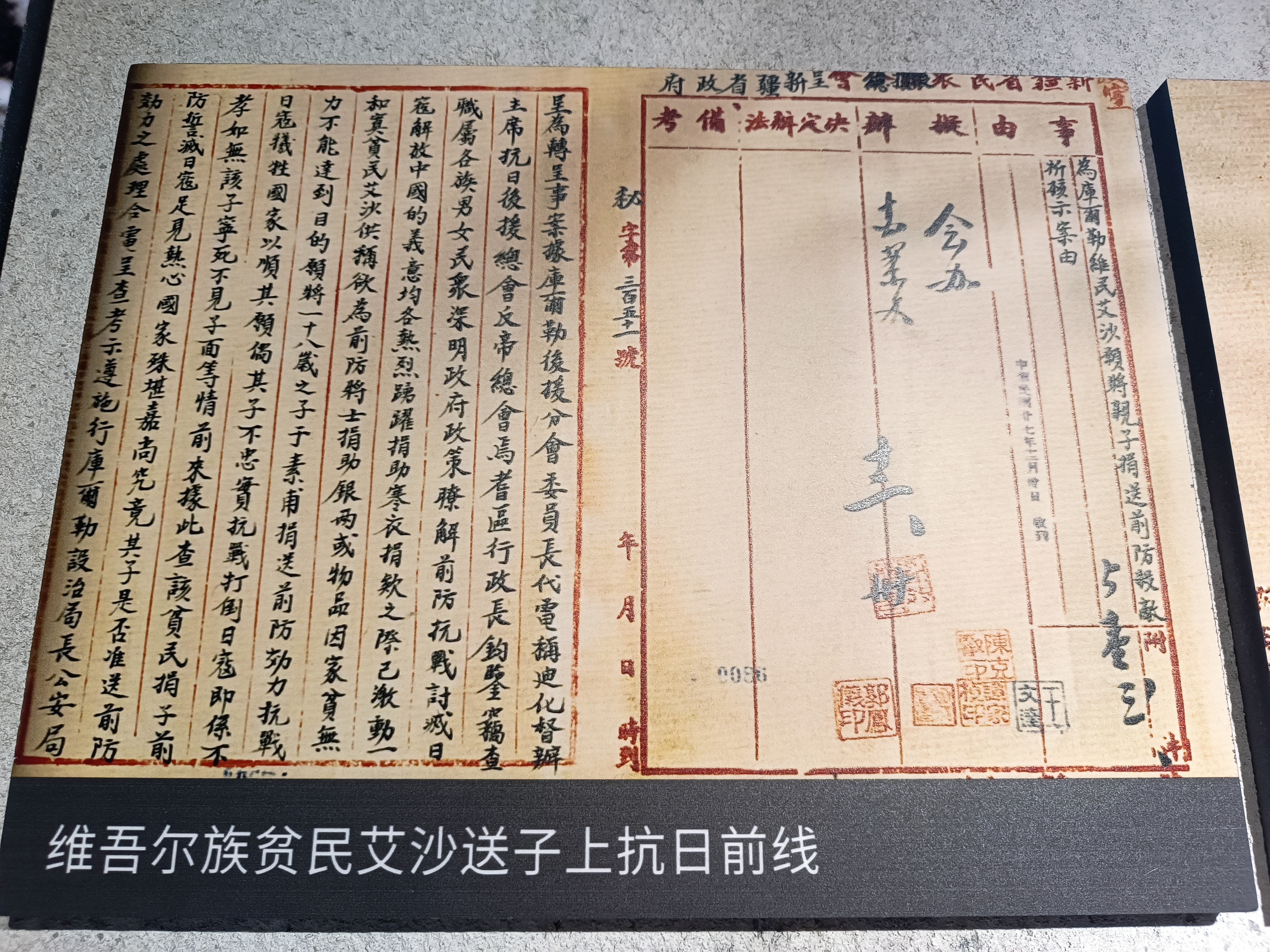 “抗战时期,新疆作为抗战大后方,在中国共产党倡导建立的抗日民族统一战线旗帜下,开展了如火如荼的抗战文化宣传和广泛热烈的抗日募捐活动,为中国人民抗日战争暨世界反法西斯战争胜利作出了重要贡献。”自治区档案馆有关工作人员介绍,新疆抗战档案是新疆各族民众共赴国难、并肩御侮的历史实证,通过系统整理、深入研究和活化利用,深度挖掘抗战档案所承载的爱国主义精神内核,让这些档案成为铸牢中华民族共同体意识的生动教材,激励新时代各族群众携手同心、砥砺奋进。
