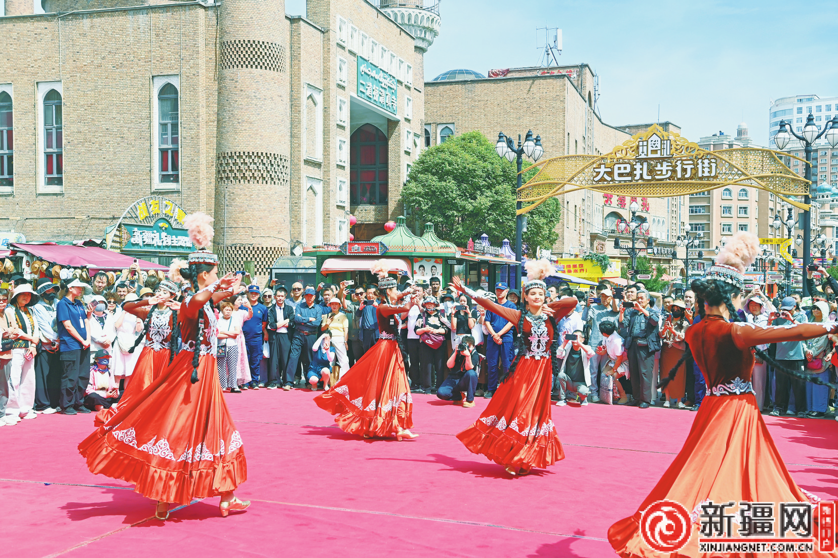 在大巴扎景区,舞蹈演员载歌载舞,让全国各地游客流连忘返。