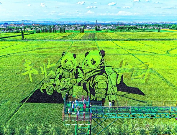 这些稻田画都是北京科可瑞照明设计有限公司董事长高枫创作的。为了能够给游客呈现出更美的稻田画,他选用了6种不同品种、不同颜色的稻种,还在“稻光谣”景区设计了灯光秀、观光小火车、特色农副产品销售展位等业态,增强了游客体验感。
