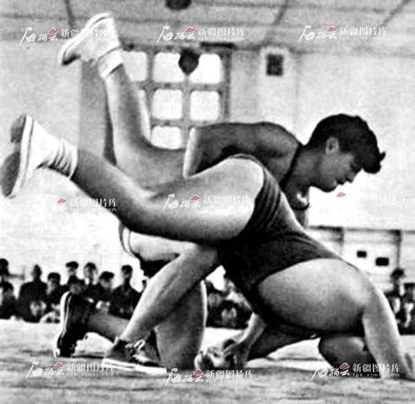 1959年9月,在第一届全运会上,新疆哈萨克族选手赛里克在重量级摔跤决赛中,获得冠军。图片由新疆图片库提供