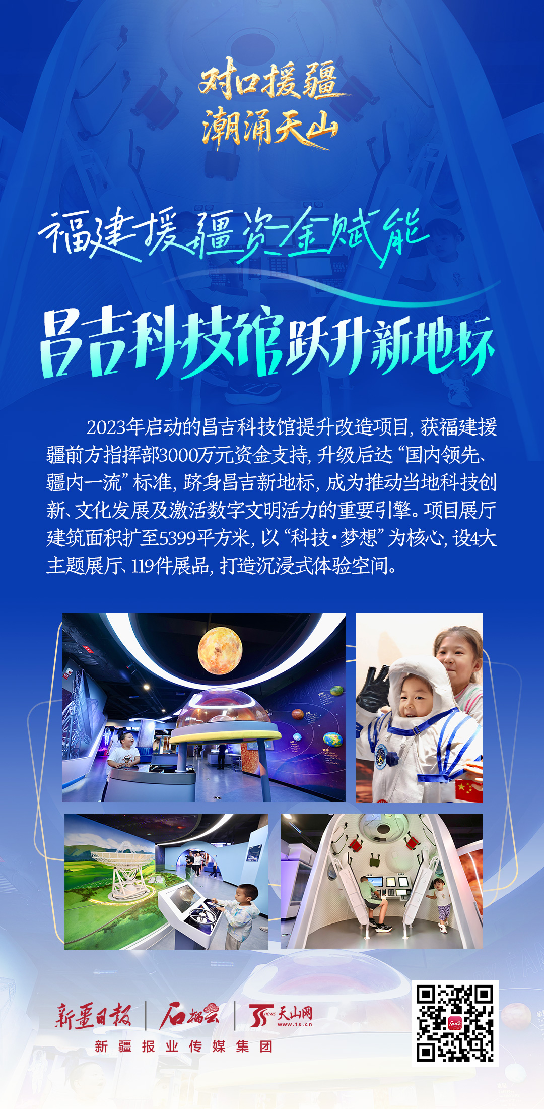 2023年启动的昌吉科技馆提升改造项目,获福建援疆前方指挥部3000万元资金支持,升级后达“国内领先、疆内一流”标准,跻身昌吉新地标,成为推动当地科技创新、文化发展及激活数字文明活力的重要引擎。项目展厅建筑面积扩至5399平方米,以“科技・梦想”为核心,设4大主题展厅、119件展品,打造沉浸式体验空间。