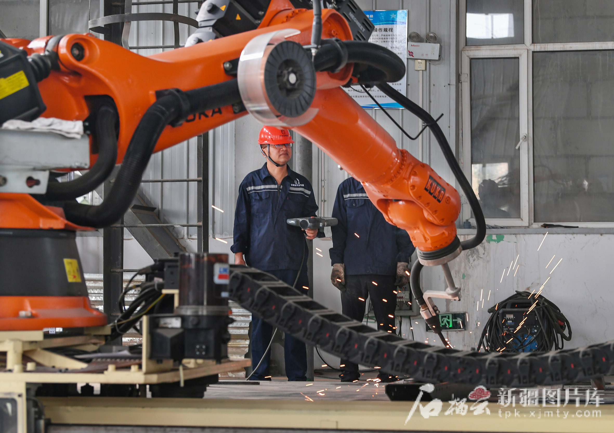 8月13日,工人在位于昆山产业园的新疆埃尔法电梯有限公司车间利用智能机器人进行电焊。