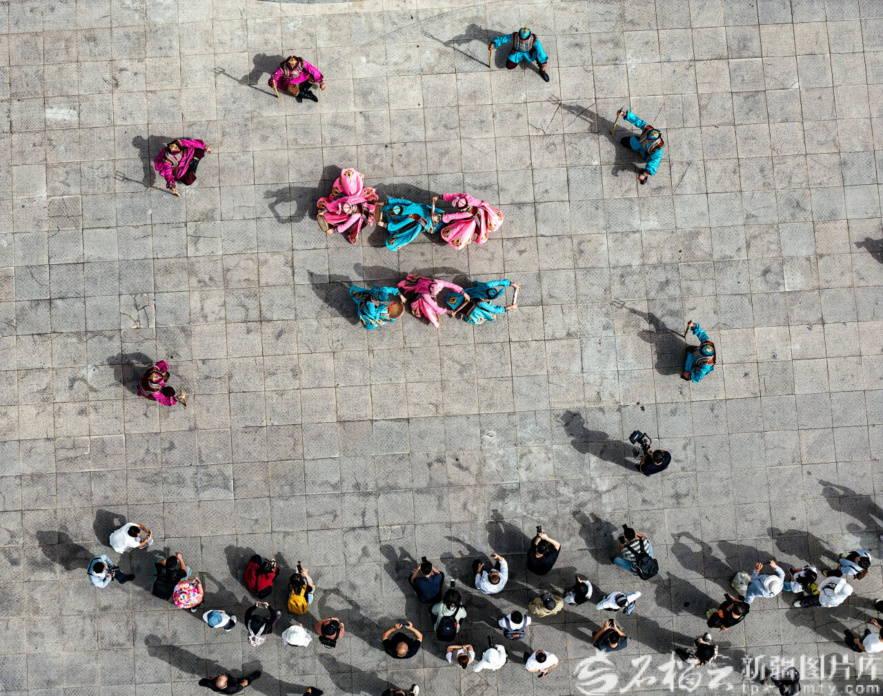 9月9日,“砥砺奋进七十载 天山南北谱华章”大型集中采访活动采访团记者在尉犁县兴平镇达西村拍摄演员表演舞蹈。(无人机摄)