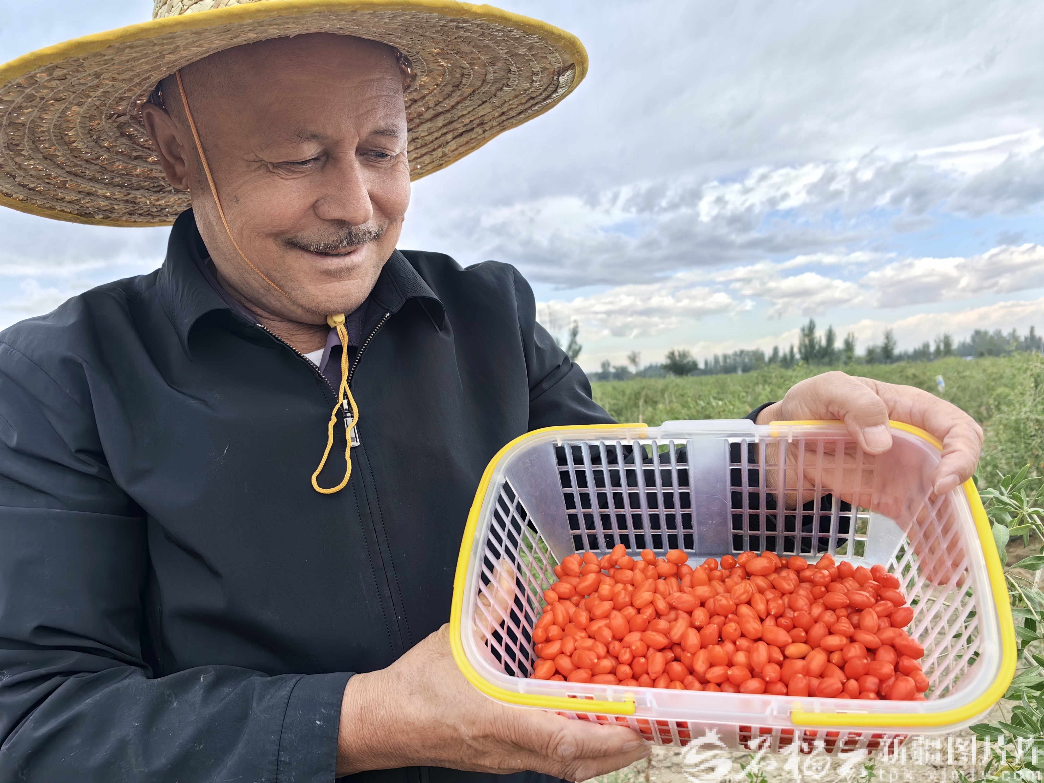 9月11日,精河县托里镇吾夏克巴依西村种植户展示刚采摘的枸杞鲜果。