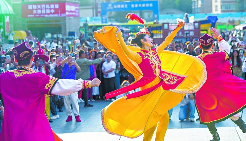 近日,游客在新疆国际大巴扎景区欣赏舞蹈。随着秋季旅游旺季到来,各地游客纷纷来到该景区拍照打卡,享受美好生活。孙振嵩摄