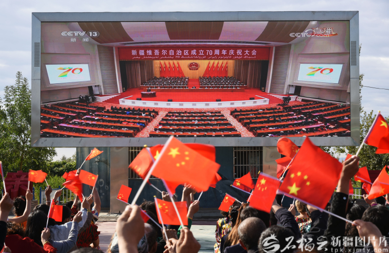 9月25日,吐鲁番市高昌区亚尔镇新城片区新城西门村红石榴广场上,干部群众、教师学生、企业职工等聚在电子大屏前,收看新疆维吾尔自治区成立70周年庆祝大会直播。刘健摄