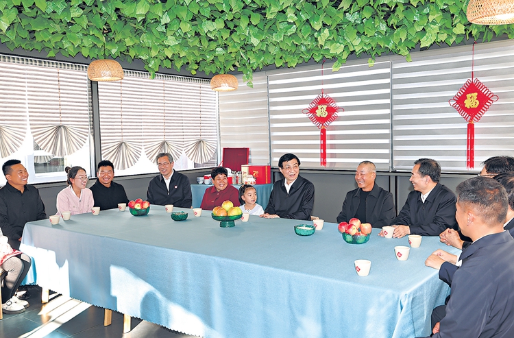 9月26日,受习近平总书记嘱托,中共中央政治局常委、全国政协主席、中央代表团团长王沪宁带领中央代表团部分成员到新疆生产建设兵团第二师铁门关市、第十师北屯市考察。这是王沪宁和中央代表团部分成员在兵团第十师北屯市同职工群众交流。新华社记者姚大伟摄
