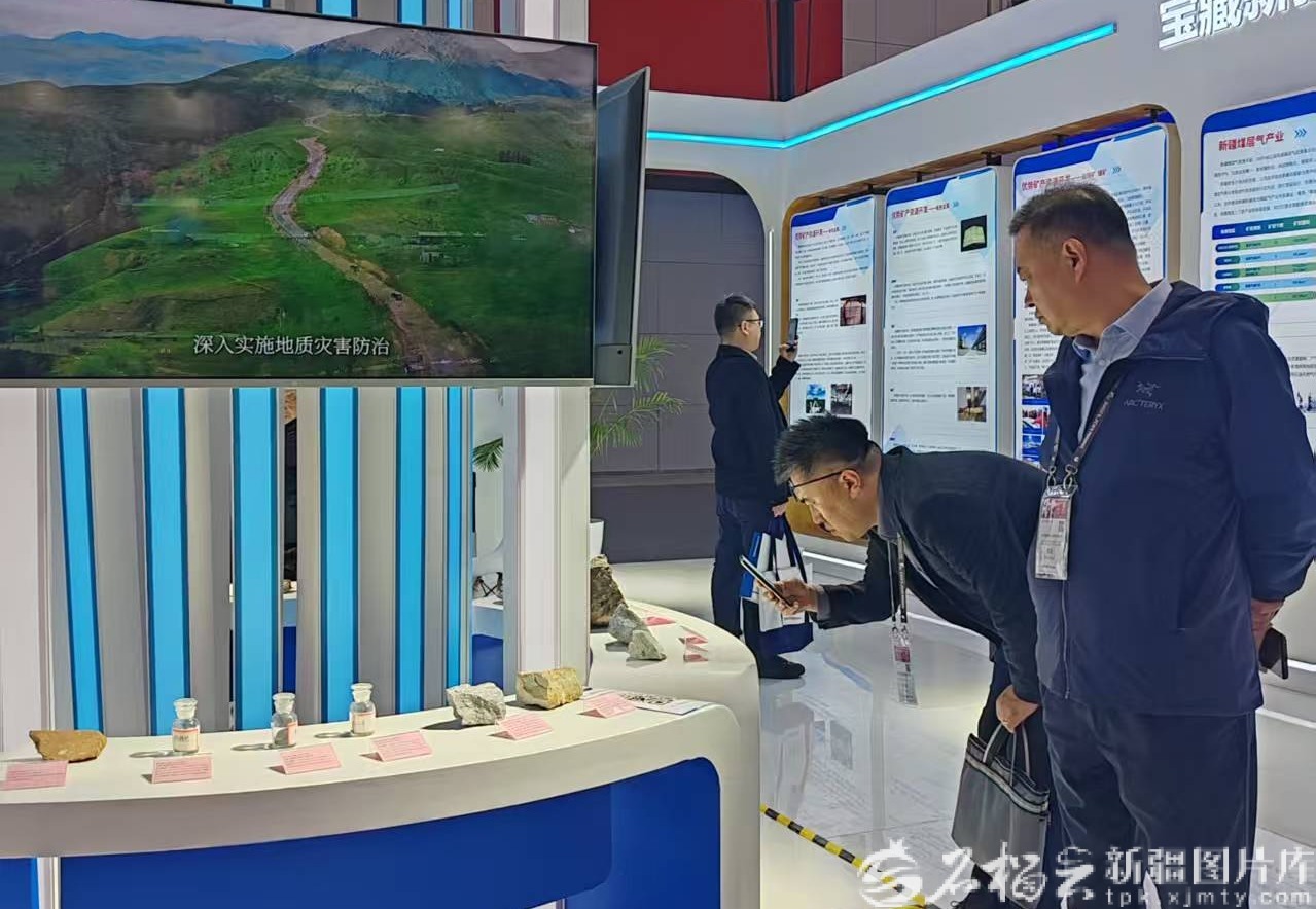 位于N5号展馆的新疆展位,蓝白色调的搭配和“三山夹两盆”的地质构造造型简洁又大气。10块展板静静地讲述着166万平方公里土地上“资源长城”的故事;LED屏里,循环播放着新疆矿产资源勘查开发成果及相关参展单位形象宣传片;中心展台上,煤、铁、锰、铅锌等高品位矿产品标本,吸引参展嘉宾纷纷驻足参观。