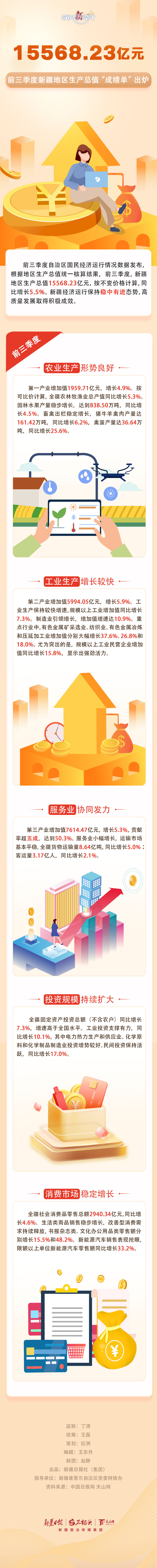 10月27日,自治区国民经济运行情况数据发布,前三季度,新疆地区生产总值15568.23亿元,按不变价格计算,同比增长5.5%。三次产业发展情况如何?投资、消费数据怎样?今天的《数说“新”变化》一起来看看。