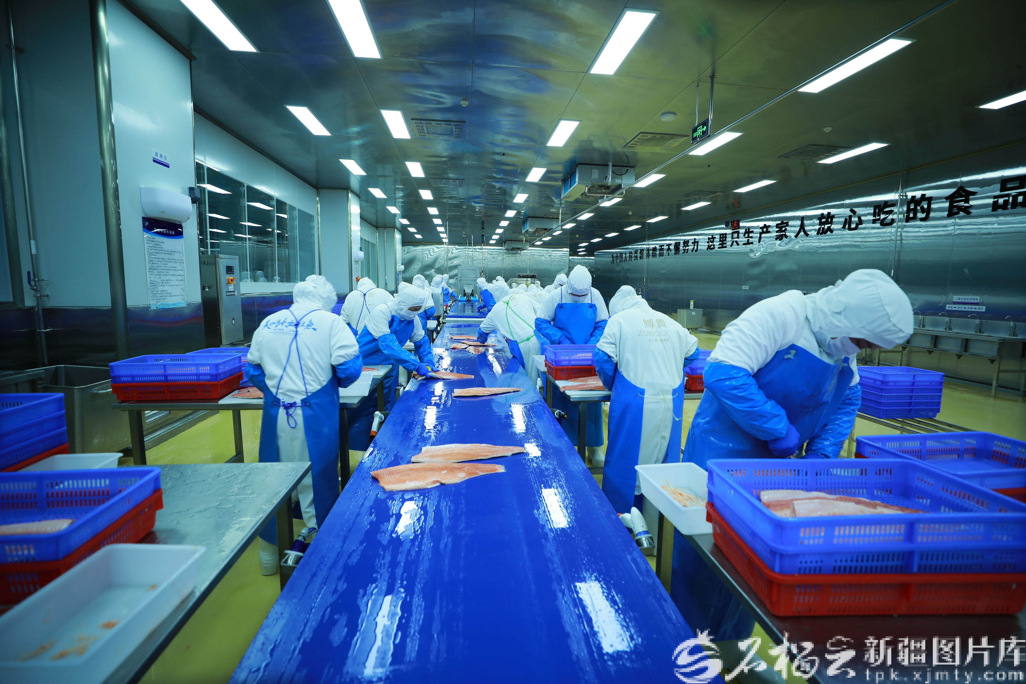 新疆天蕴有机农业有限公司三文鱼深加工厂,工人在加工三文鱼。赵学林摄