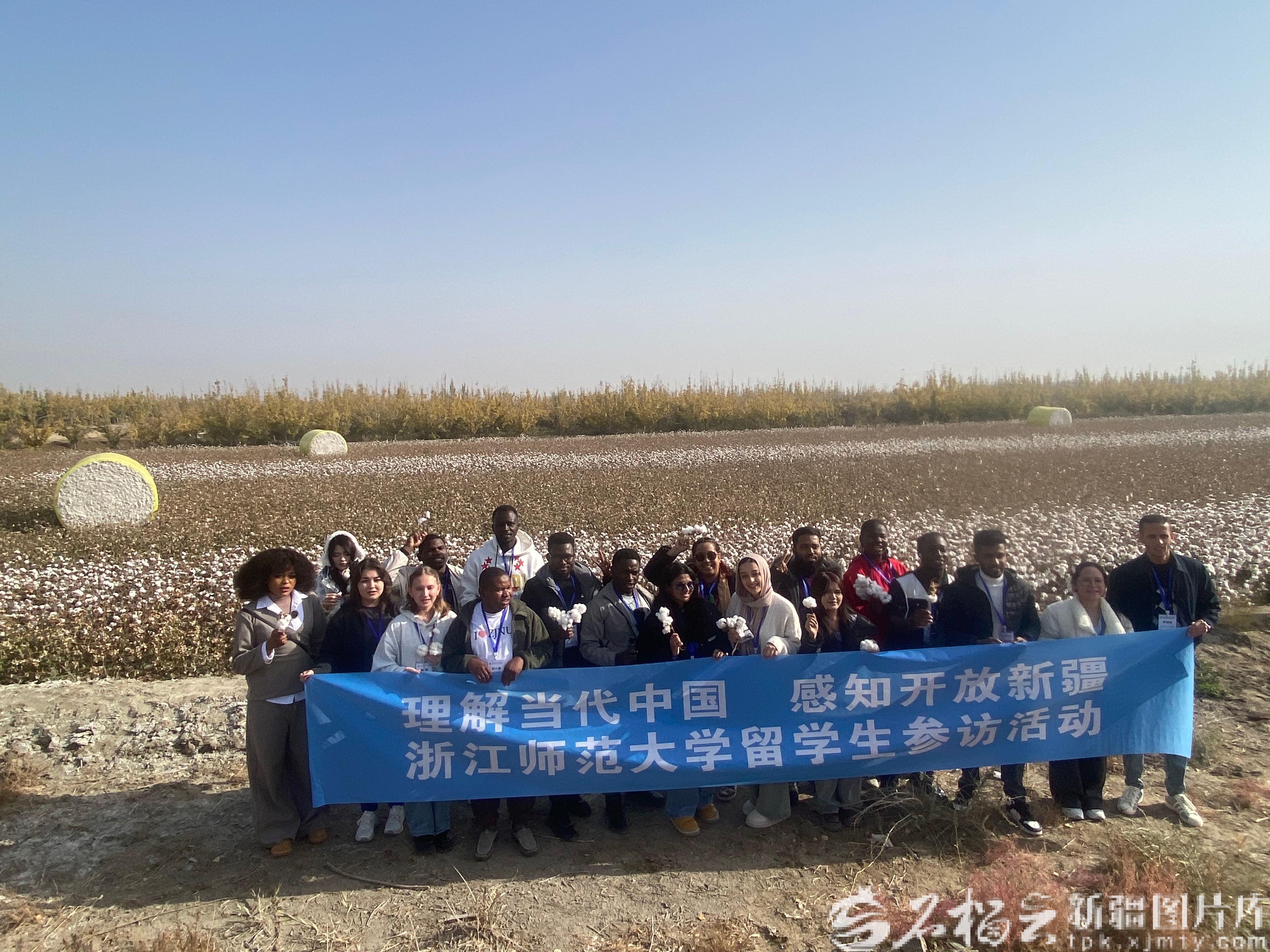10月24日,留学生在绿洲农场的棉田边合影。天山网-新疆日报记者 沈祖孝摄