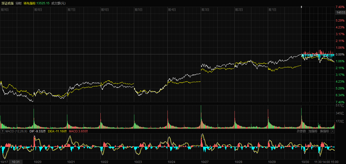 天山网-新疆日报讯(记者康颢严报道)10月30日,A股三大指数集体回调。截至收盘,沪指跌0.73%,报收3986.90点;深证成指跌1.16%,报收13532.13点;创业板指跌1.84%,报收3263.02点。沪深两市成交额达到24217亿元,较昨日放量1656亿元。