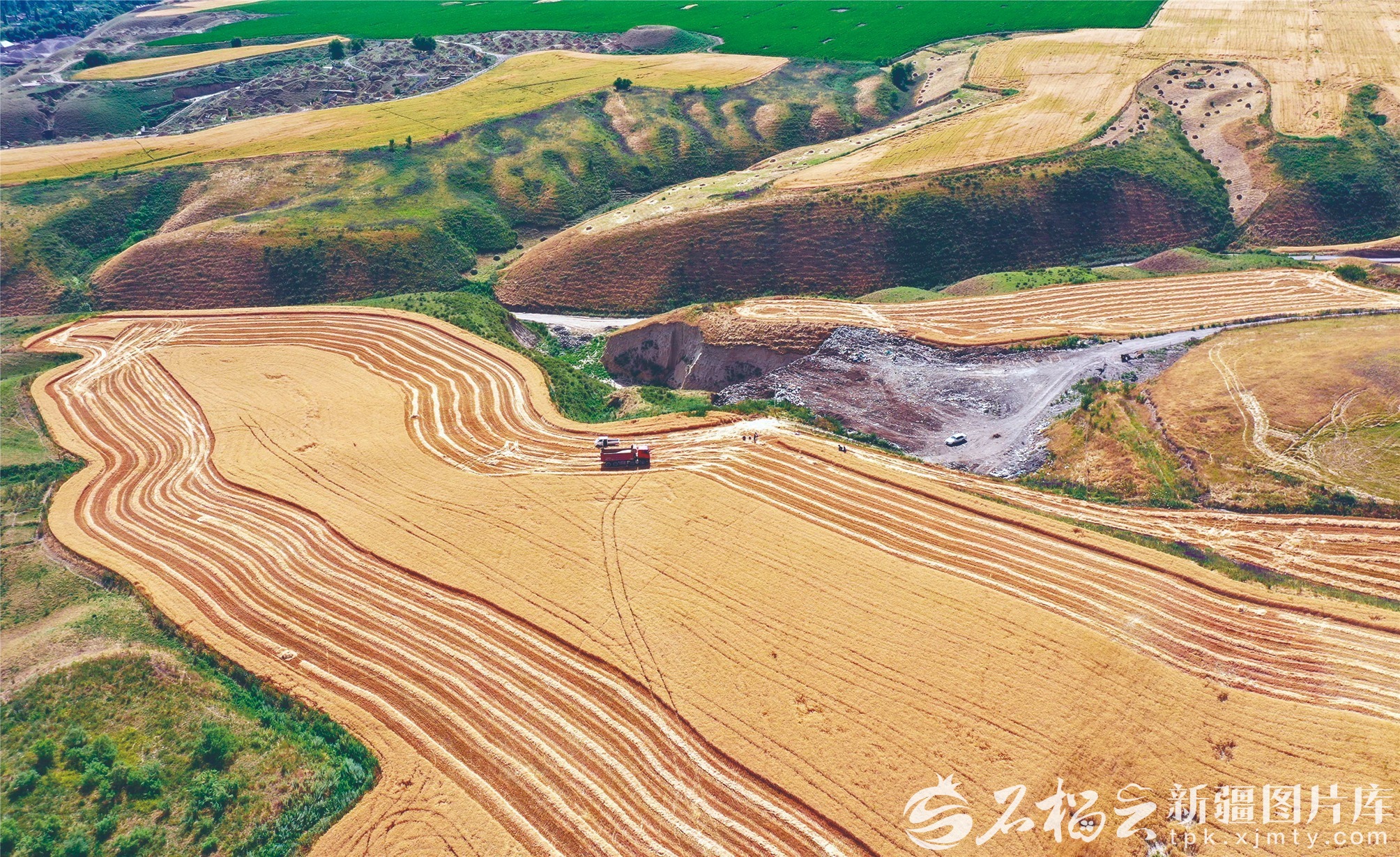 在新源县则克台镇则克台村,大型收割机在麦田里作业(资料图片)。张文庭摄