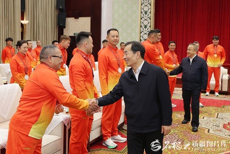 12月4日,自治区党委书记陈小江、自治区主席艾尔肯·吐尼亚孜同载誉归来的第十五届全国运动会新疆体育代表团获奖运动员、教练员代表亲切交谈,代表自治区党委和政府向他们表示热烈祝贺。天山网-新疆日报记者 崔志坚摄