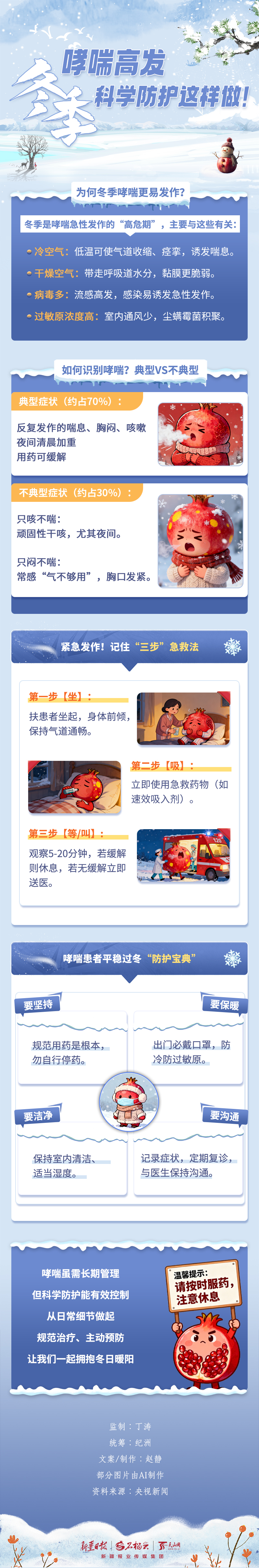 随着寒潮来袭,气温骤降,冬季成为哮喘急性发作的“高危期”。如何科学防护、安心过冬?本期“小石榴说科普”为你一一梳理。