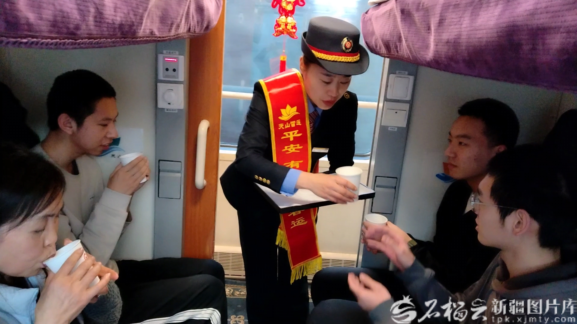 列车乘务人员为旅客送热水。姚雪摄