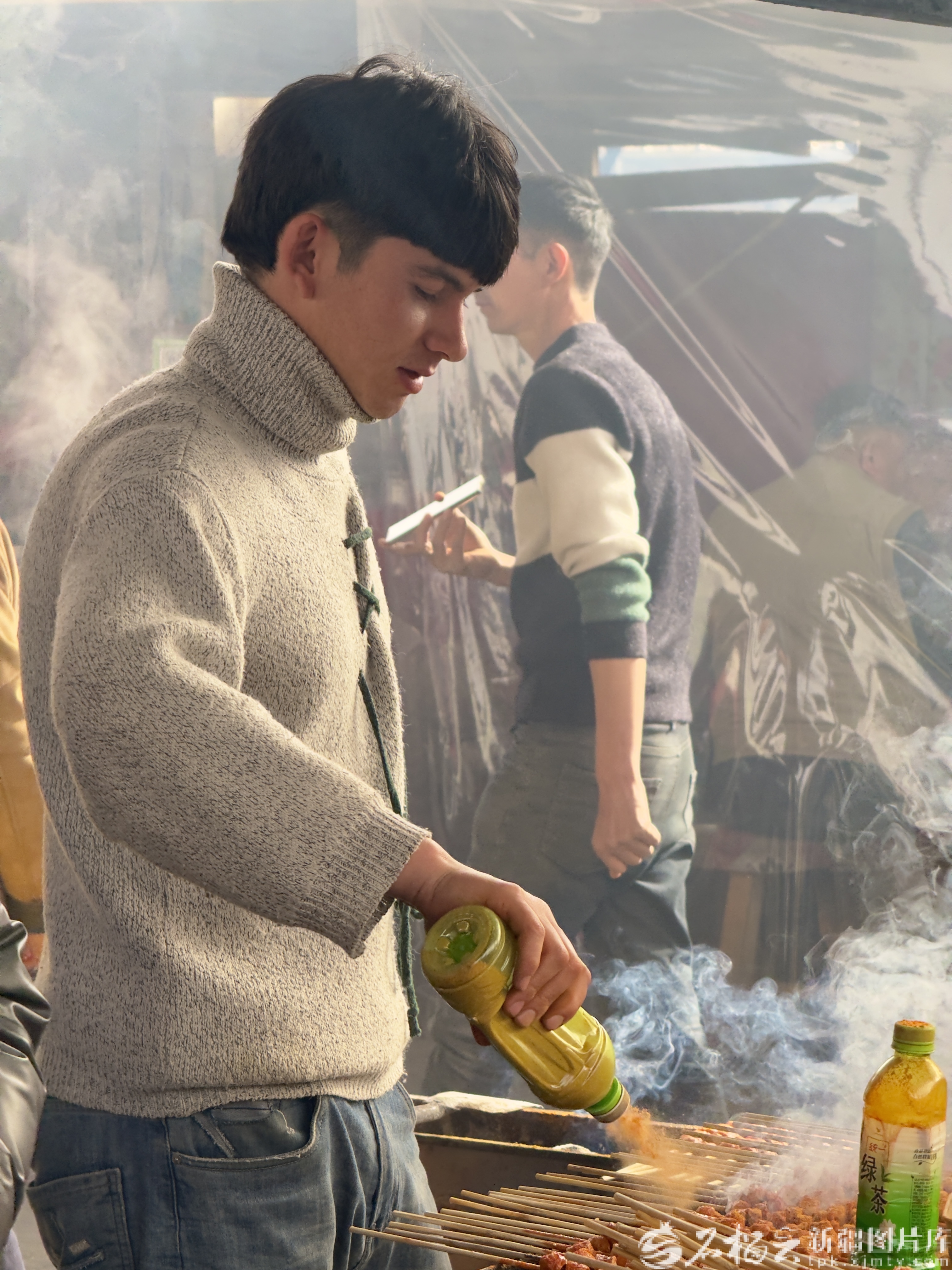 2月10日,皮山县木吉镇巴扎餐饮区烧烤摊,烧烤师傅正在烤制美食。天山网-新疆日报记者 拍热扎提·阿不都 摄