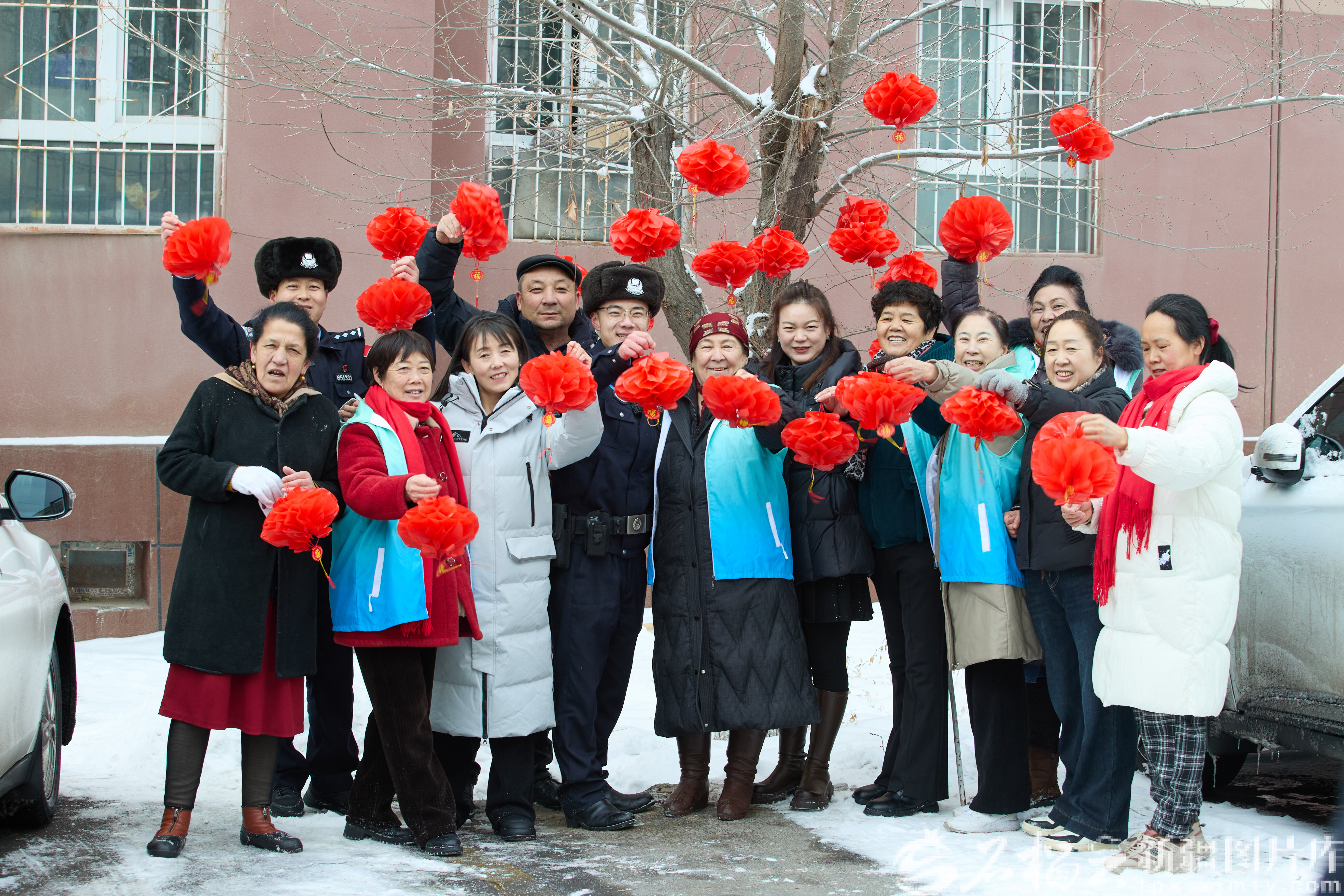 2月15日,“星火义警”志愿服务队的志愿者们挂灯笼后合影留念。芦胜磊摄