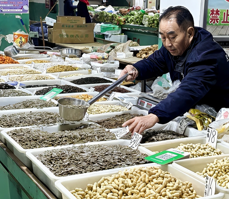 摊位前,前来买年货的顾客络绎不绝。朱学功满是老茧的手熟练地拿起铲子,给顾客称了瓜子,递过去时,脸上满是憨厚的笑容。