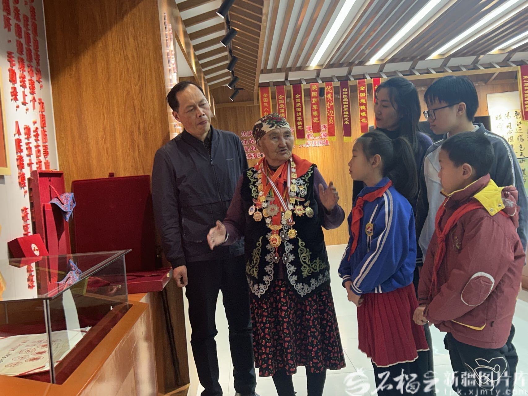 随后,布茹玛汗·毛勒朵带着他们走进了戍边纪念馆。她走在前面,指着展柜里一件件斑驳的巡边工具、一张张定格岁月的老照片,慢慢讲述自己巡边护边的故事:刻下“中国石”的坚定,守护国土的初心……大家静静站着,听得入神,感动的泪水悄悄浸湿了眼眶。