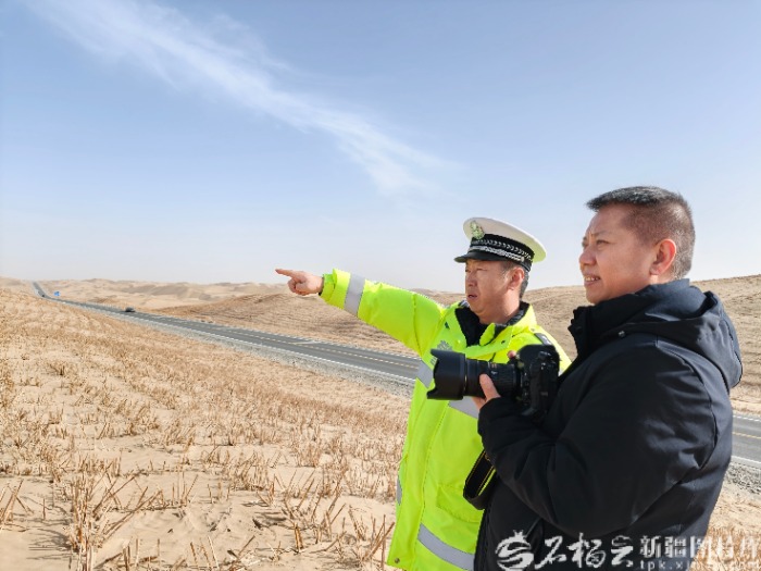 2月2日,天山网-新疆日报记者杜建辉(右)在穿越塔克拉玛干沙漠的尉且沙漠公路开展采访。薛云少摄