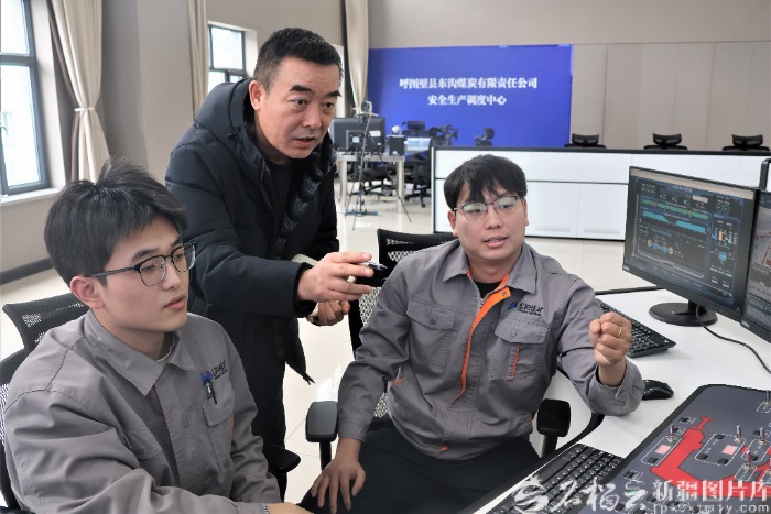 2月1日,天山网-新疆日报记者盖有军(中)在呼图壁县东沟煤炭有限责任公司采访。程勇摄