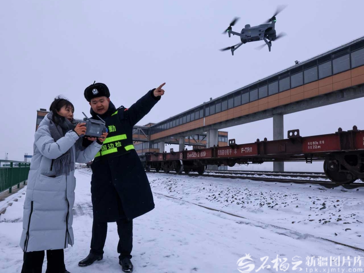 2月16日,阿拉山口口岸铁路综合查验场,天山网-新疆日报记者白素君(左)体验用无人机查验列车。赵越摄