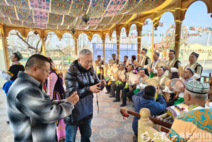 2月9日,天山网-新疆日报记者陈疆林(左一)在阿瓦提县采访民间艺人排练村晚节目。荆云辉摄