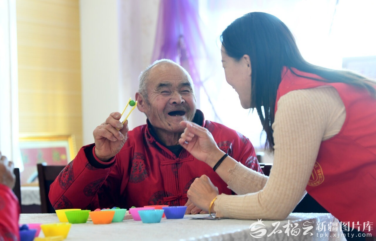 2月6日,裕民县社会福利园区工作人员与老人一起做游戏。记者 韩亮摄